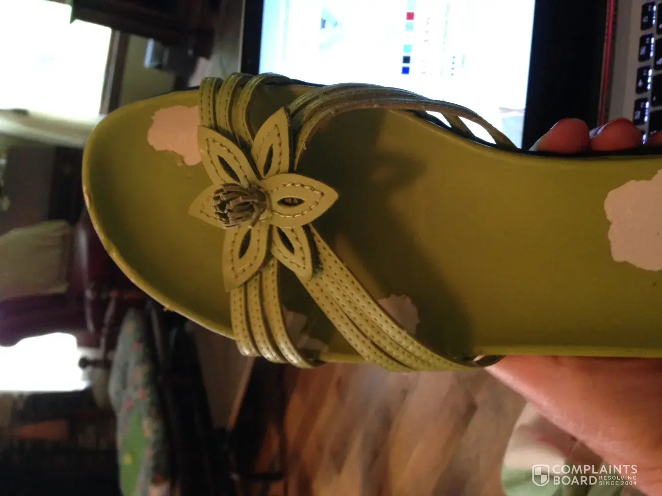 I have two pairs of Croft and Barrow sandals that are identical except for the color. One pair is white, the other a light green. They are not new, but each has been worn very little and show no signs of wear on the bottoms. The white pair has been worn a few times more than the green, and I've had no problems. With the green pair, however, the color layer of the inside of the shoe has begun to peel away. After only an hour or so of wear, the inside of the shoe sticks to my feet, so when I take them off, the thin layer of the shoe tears away in large sections.. It is not in any way due to sweat or anything from my feet, because the same thing is happening to the color material on the side of the shoe, which is not in contact with my feet. At this time the sides are just separating, or "bubbling up", however, and have not actually peeled away.