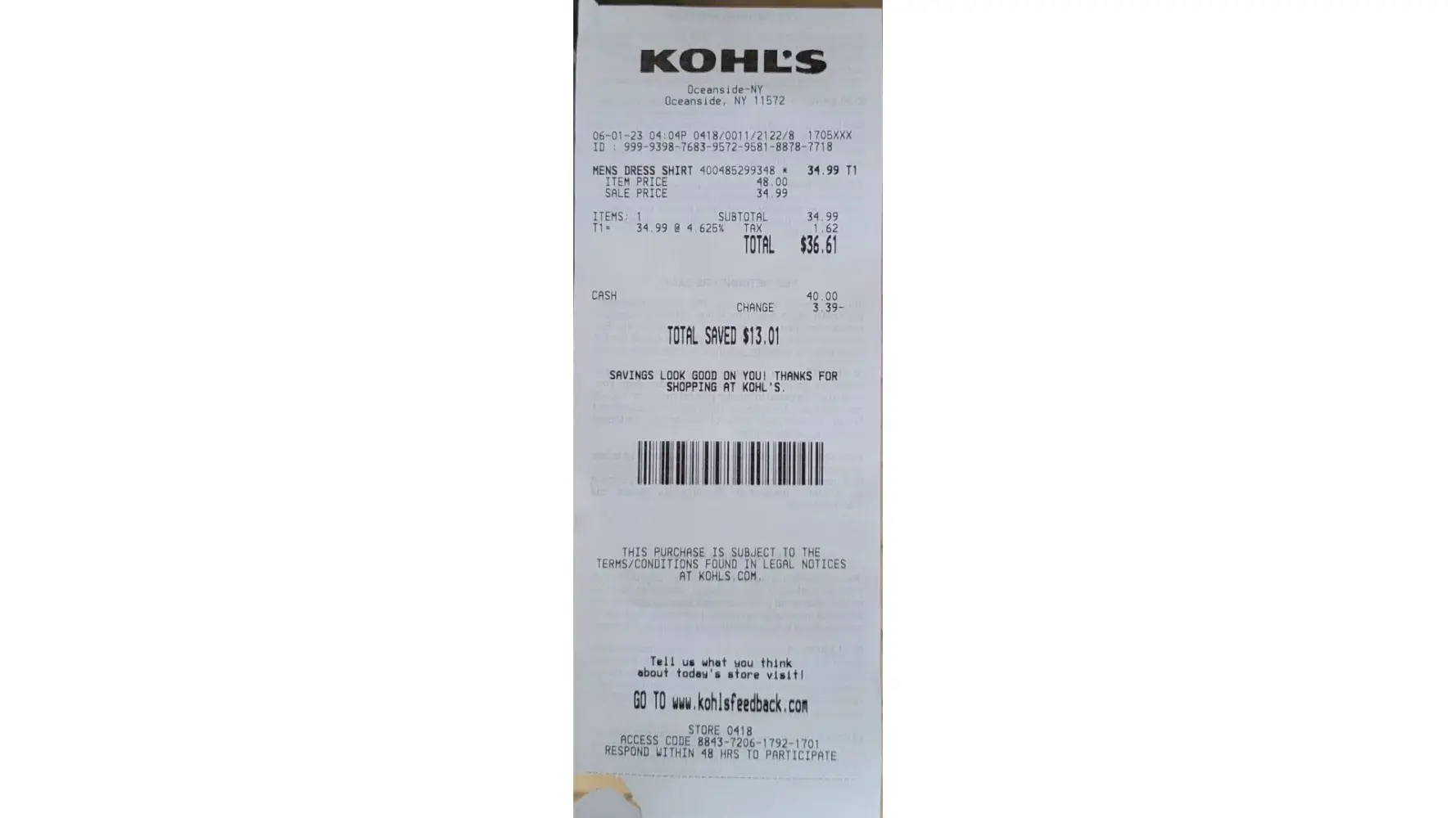 I’m writing to complain about an unacceptable experience I had at your Oceanside, NY location (Store 0418). I want to preface this complaint by saying that I am a loyal Kohl’s shopper and have appreciated the fine customer service that I have received in the past. On June 1, 2023 at 4:04 pm, I attempted to purchase two (2) Apt. 9 Performance Dre...