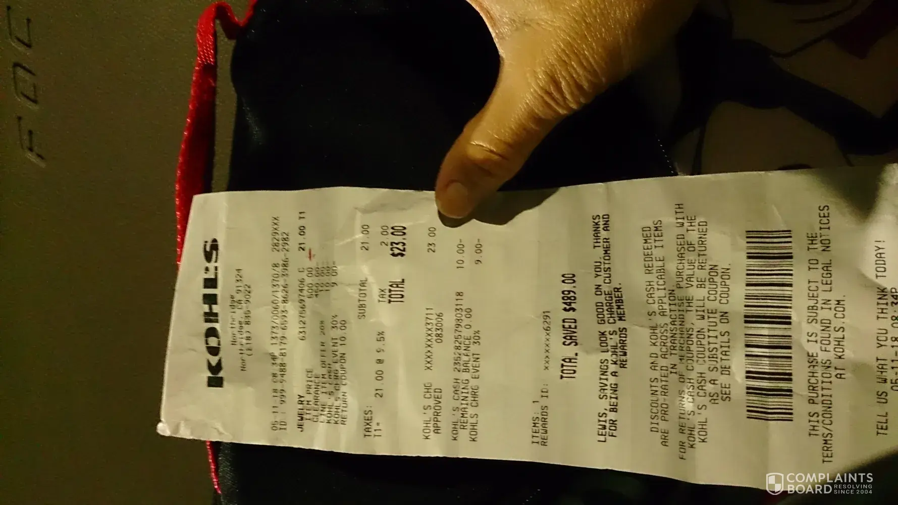 I was shopping May 11 2018 late in the evening and making my way to the checkout counter picked up a bill laying on the floor which said a jewelry purchase of retail price was discounted from 500.00 to just 21.00...asking two jewelry counter sales girls I got a well there are probably gone to I don't know...so I asked the sales associate who checked me out and she was puzzled and also two customers... they were puzzled...so here I have included the receipt...then after my purchase I was accessed outside by security girl saying I took something from the store...so I said...well can you tell me what it belongs to...and I showed her my purchase I said it was paid for and approved when I checked out so she starts wanting my license number and where is my car and she's on the phone with cops...the item was a decoration that went to nothing something that fell off another item...it was thin coin purse...no tag.. did not say Kohls just said not for resale inside and was orange...so I gave it to the lady at the register and she just rang up the tagged purchase...so my mom got out of the car to tell her nothing was taken...it was in full view...so then she says I was in there two years ago intimating something with this comment...funny I don't live in the area and am visiting. Since I asked four people about the transaction I feel this maybe inhouse theft...because how can you get jewelry discounted from 500 to 21 dollars?