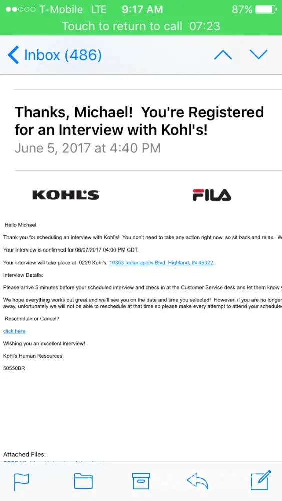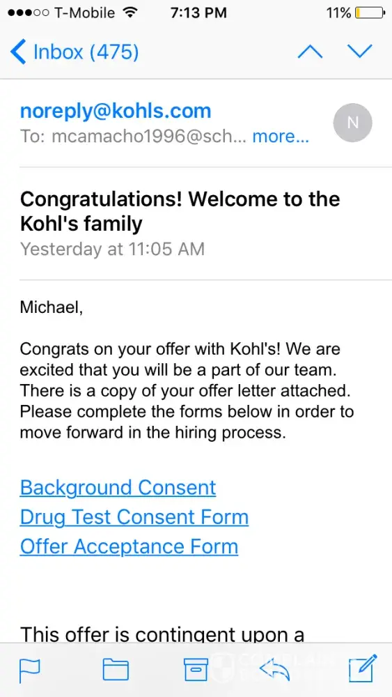 Hi my name is Michael Angelo Camacho I was recently hired at Kohls in Highland IN.I was hired by Mark the date is in the screenshot. I was sent the background consent form, drug test consent and offer acceptance form. My email was [protected]@schk12.us which turned out to be old and invalid which no longer allowed me to send further messages. I apologize for the inconvenience but my new email in now in, if you can resend it to this email address that would be great thank you can contact my phone number [protected] my email was no longer valid because it was from Morton Highschool but since I graduated it became invalid. Please contact me as I am eager to be a part of the Kohls Family.