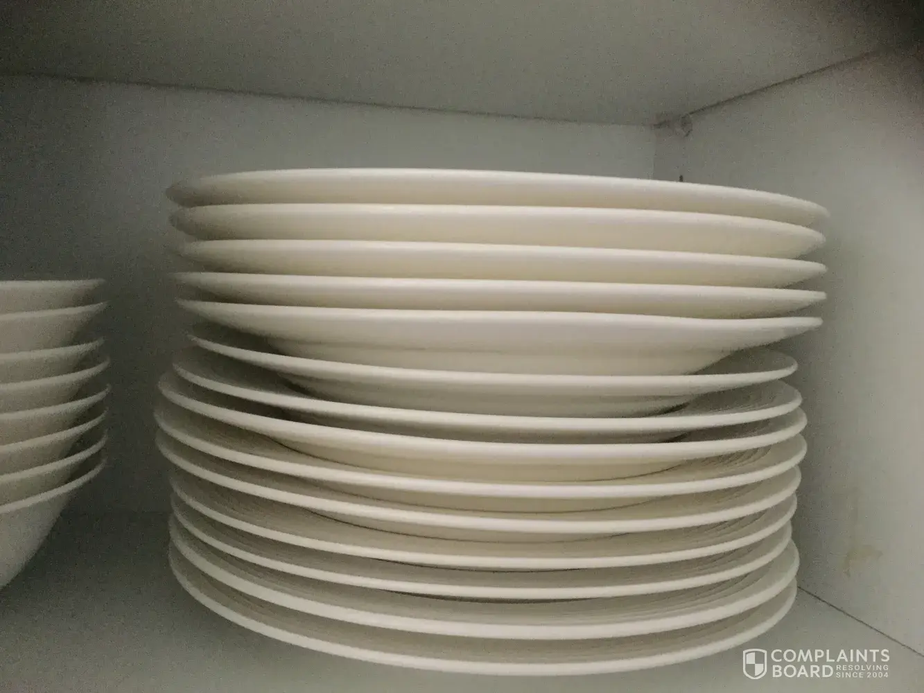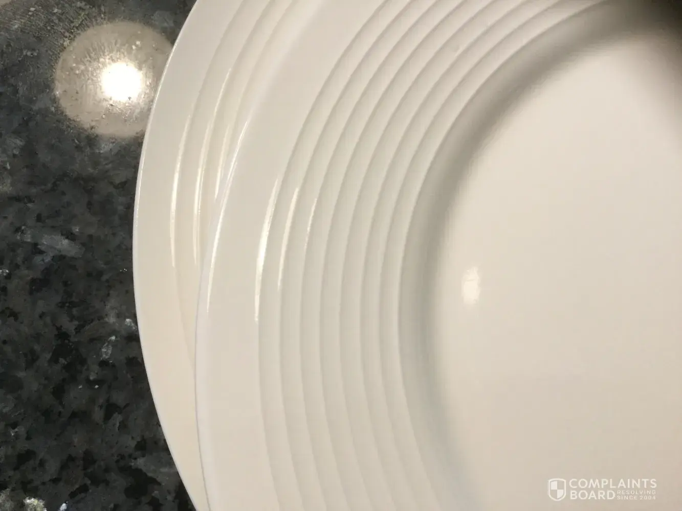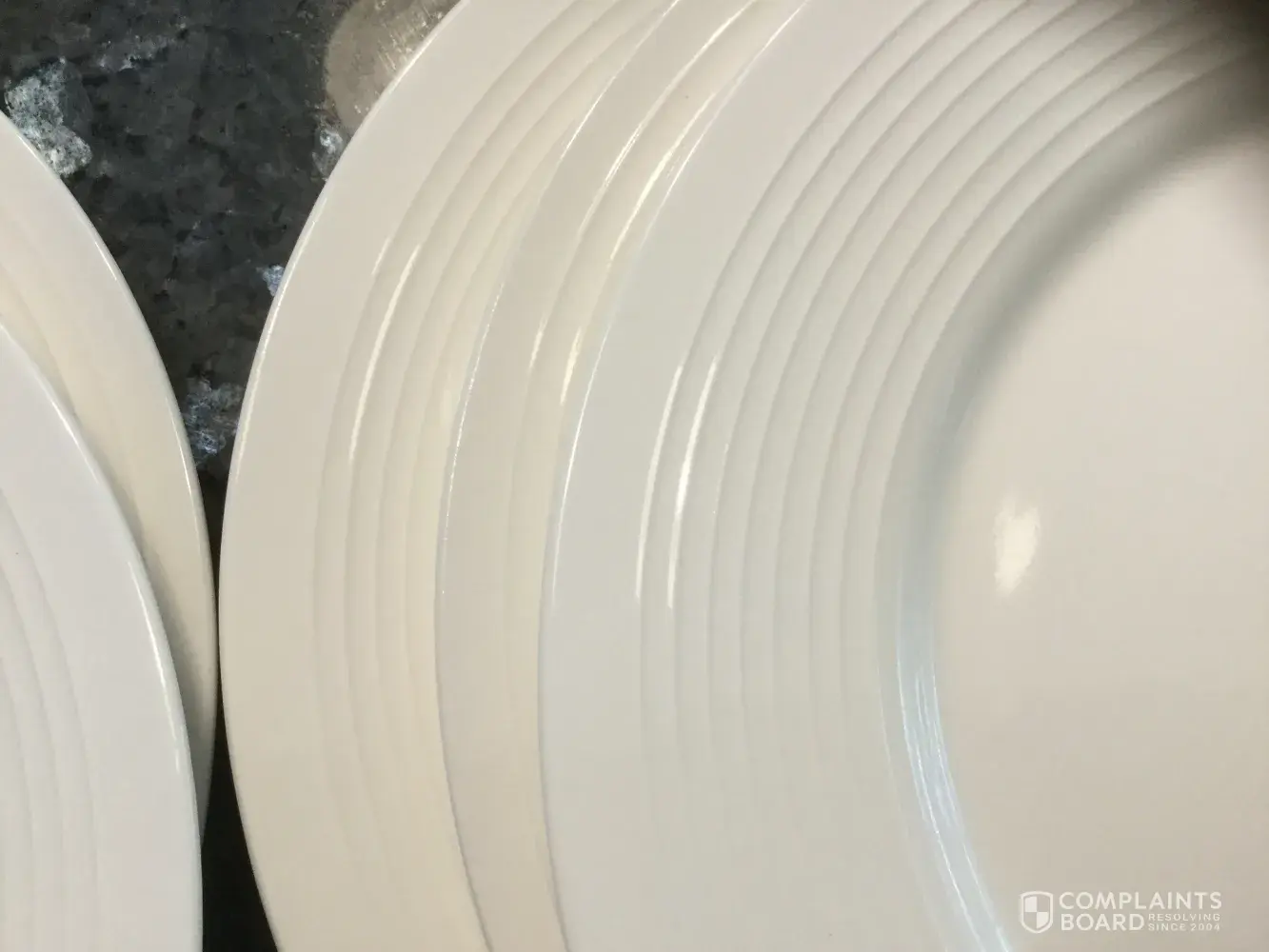 I purchased two 40 piece Food Network Stoneware Dinnerware Sets as a house warming gift for my daughter. The dishes were packed very tightly. At dinner we noticed the plates all didn't match, different shades of white & the lines on the plates were uneven. I took a photo of how the plates stack unevenly in her cabinet. I was shocked that the Food Network would let a product leave their factory in this condition. The ridge on the bottom of some plates are chip too. Hoping you will replace the 2 with perfect white sets.