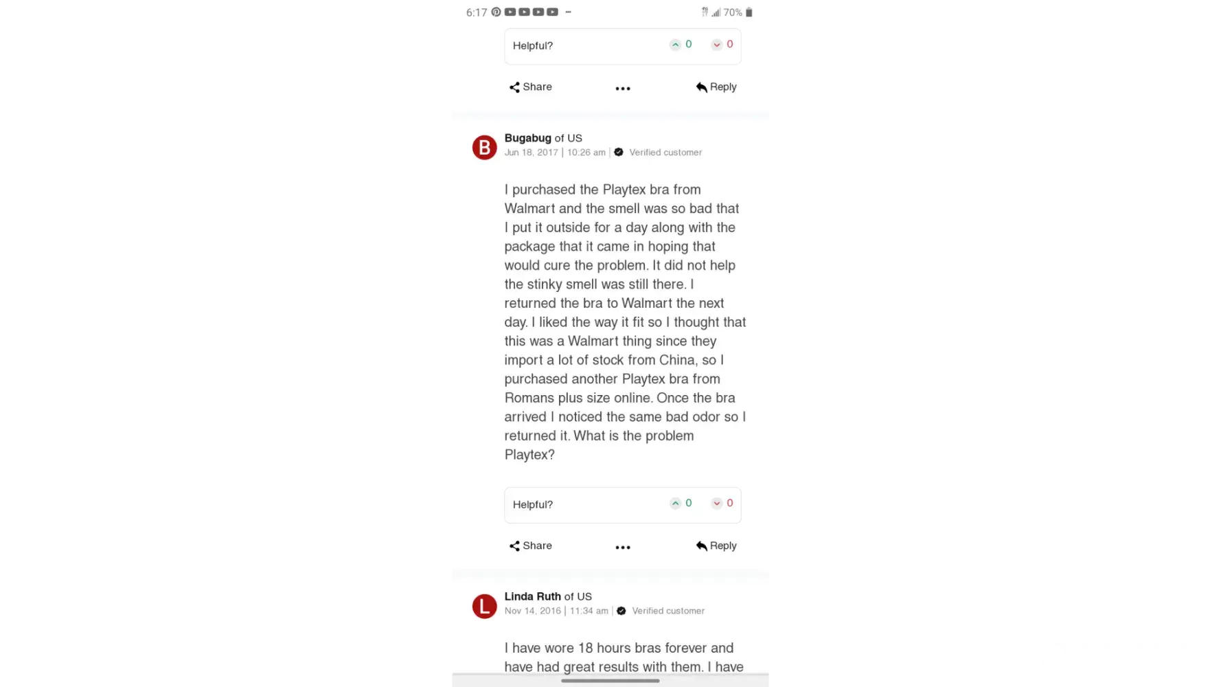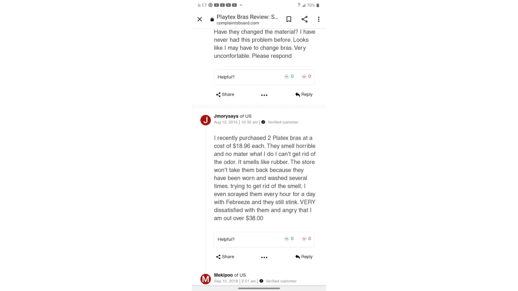 I purchased 2 Platex 18 Hour Bras approximately 2 months ago. I have been a fan of this product for many years. I purchased these two bras at the Kholes in Menifee CA. The problem I have with these bras is that they have an odor that I can't get rid of. I have tried soaking them in Downey, bleach and that stinky smell remains. It's body odor. I have saved some reviews from others who are experiencing the same thing. I can't return them #1 because they have been worn. I was hoping that after a few washes the smell would go away. #2, I have no receipts. I decided that I would just wear them around the house like an old dress but I stink. You might want to stop selling them. I will upload the complaints from other people for you to read. My Credit Card information is