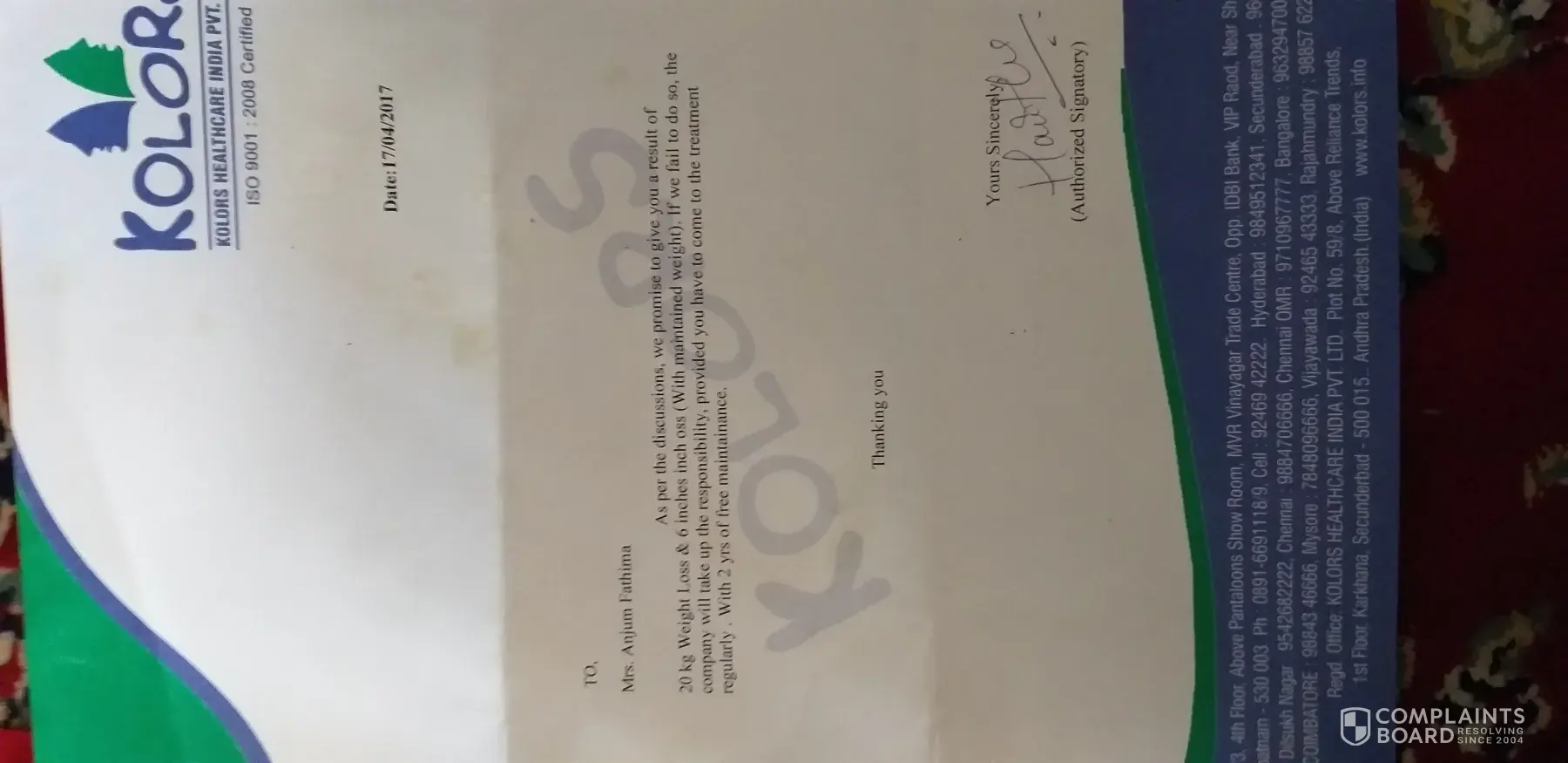 I updated the above statement to Ram and he told if she getting fear then not required to send her for this treatment. instead you come and join. If she want to come again i asked to provide an assurance that during this treatment if something happens to her or if she died Kolors has to take sole responsibility and not agreed to provide such a kind of statement. And i asked even you are asking me to provide one more chance, after this if you people not reduce the weight which you committed you have to return the amount, He not agreed that also. So you people are only focusing on the money not about the customer health and their pains.