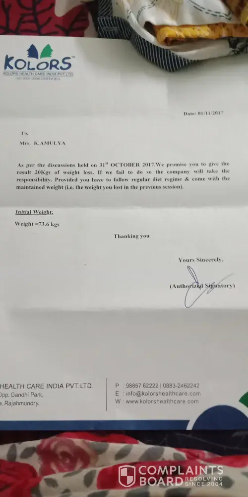 I payed rupees 50, 000 towards kolors india and was promised for loss of 20 kgs and 6 inches inch and they promised to take the complete responsibility of there programme.Now they have been asking me to drop the programme since many day's when i enquired for what reasons are the asking me to drop they haven't given any proper reason.And they arent taking any responsibility for what they promised.So hereby i need proper justice and result or compensation for everything.