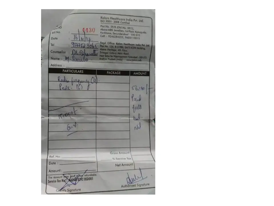 Hi good morning sir, This is sirisha from khammam, i am also one of the client in your colors. So lost year 16 nov, 2014 condeact the even in khammam, i had taken the Radio frequency lazier treatment Dr. Bhrathi Garu. *Total my package amount worth rupees is 56, 180.00 they are gave to me 4 radio frequency, 6 peels and worth Rs.15000 free package. So I have 3 sittings are taken from Hyderabad and remaining service is using from vijayawada branch, i asked to Meenakshi from the free package information send to vijayawada branch. She was told to me one month back. I will send the mail to vijayawada branch. *I have using this so many time calling to Narasimha rao and Meenaki they not given any response. Lost month 15 called to Meenakshi she resons to my call on 31, oct, 2015 she told to me we are busy and 2nd, 3rd month of nov, 2015 transfer . *your free package is used for this month ending and your paying 1500 rupees of tax. In the event time they are told to me we dont have any tax amount. *To day also many time call to Meenaskhi she dont left her mobile. My offering time is ending of this month. Note: In your colors gives 2 or 3 sittings they were asking the give me a feedback and after that they don’t have care of clients. if your give your mail id i send my package bills. please help me .