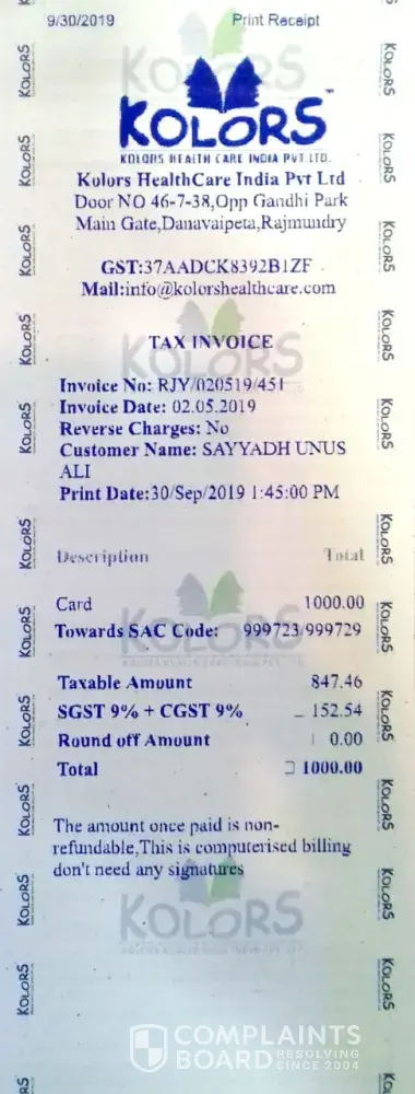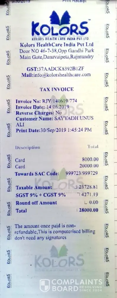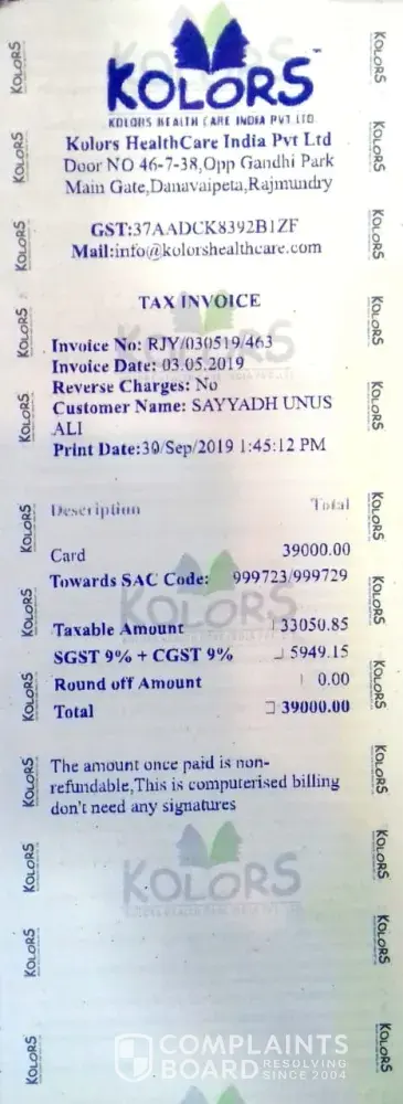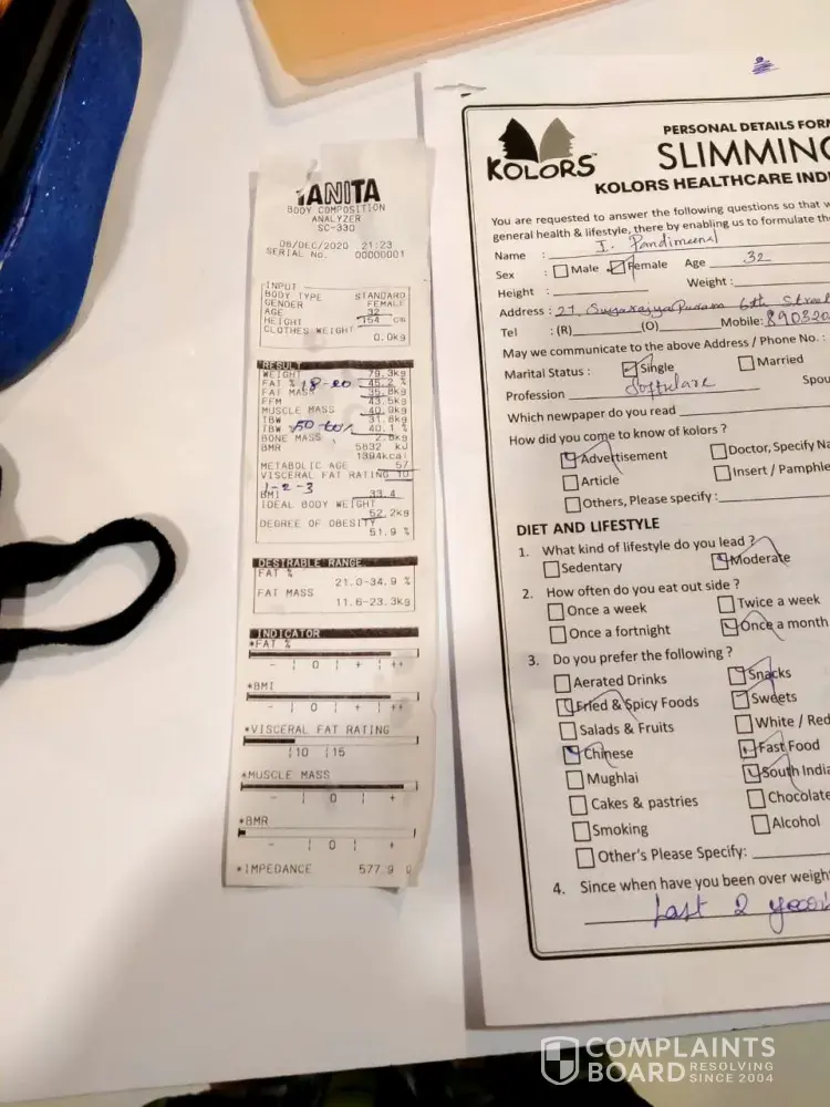 I have seen an advertisement about kolors healthcare india (P) ltd, i thought that kolors is good place for the treatment and i have joined in 6 months back and i am not seen any change in my weight and treatment is very poor. I have got side effects as well. When i ask them about the refund if i want to discontinue they are saying that i have to bring a customer then i will get the payment. I have paid rs 46, 500 / - for this treatment. I am not getting proper response from these people. Please kindly help me in getting my amount.