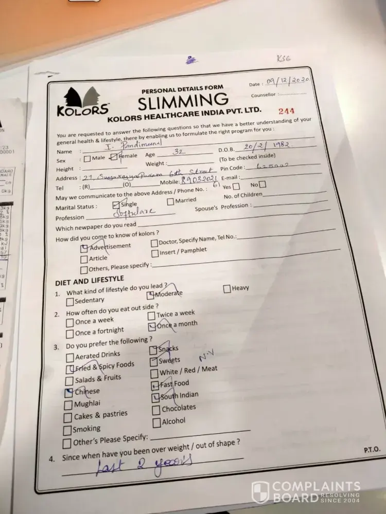 I had not even reduced 1 kg of weight, since 1 and half years, but they record and obtain your signature as if I had lost a few kgs. Now the person at kolors do not allow me inside the treatment room because I have exceeded the time frame. At the time of joining and collecting the full fees in total, nothing was disclosed and no such clause was mentioned either at the agreement or at the fee receipts issued.
