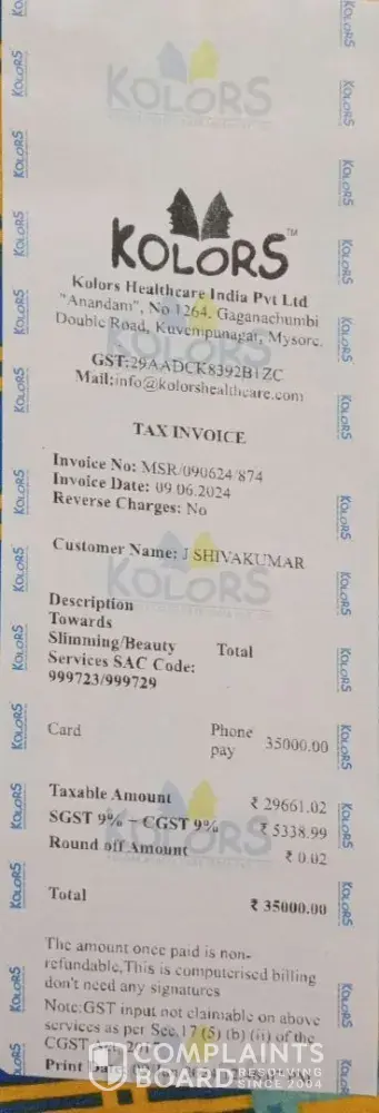 Dear all, I'm Alekhya and 23 yrs old. I was diagnised with rheumatoid arthiris an yr back and due to medication i put on 25 kgs.. So watching their advertisemnt on tv i opted for these cheaters.. Initially they spoke very wel till we gave them the entire money.They dint even give proper bills and no guarantee. after paying money they just leave yu unattended. I was charged 75000 fr 20kgs weight loss. Till now they dint give me prper seating only. Now when we are asking them they reply very arrogantly saying they r busy. I could affrd this 75000 but still managed to pay just becoz of my health issue i was very desperate abt losing my weight. They told me no heating pad with me kept and only massages will be given.But this is all FALSE. All they do is make you sleep under heat pads. Please dont put your hard earned money on these cheaters.. I just feel i have trouble my parents a lot in put all the money in this Stupid treatment. i JUST hope government takes necessary actions against these people as they making people sign on some papers with stupid terms and condtitions and they not even leting us read and covering up everything with sweet words. The MD of Kolors should be sued by the Court of Law. Please someone take action against these people.