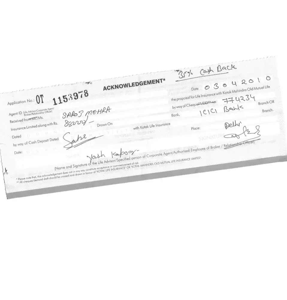 I had deposited an amount of Rs. 15000.00 through cheque no. 790606 drawn on Vijaya Bank, V.N. Marg, Allahabad Branch and the same was debited to my account on 5.8.08. The cheque was drawn in favour of Kotak mahindra life insurance co. Ltd. and was paid to them through their Banker Kotak Mahindra Bank Ltd. Allahabad Branch through clearing. The cheque was drawn and sent to you through your authorised Sales Manager working in Rajajipuram, Bangalore Branch alongwith a completed application form to purchase an Insurance Policy in the name of Mr. Siddharth Tiwari, s/o Mr. B.P. Tiwari, r/o A-38 Gangotri Nagar, P.O. Dandi, Allahabad - 212103.