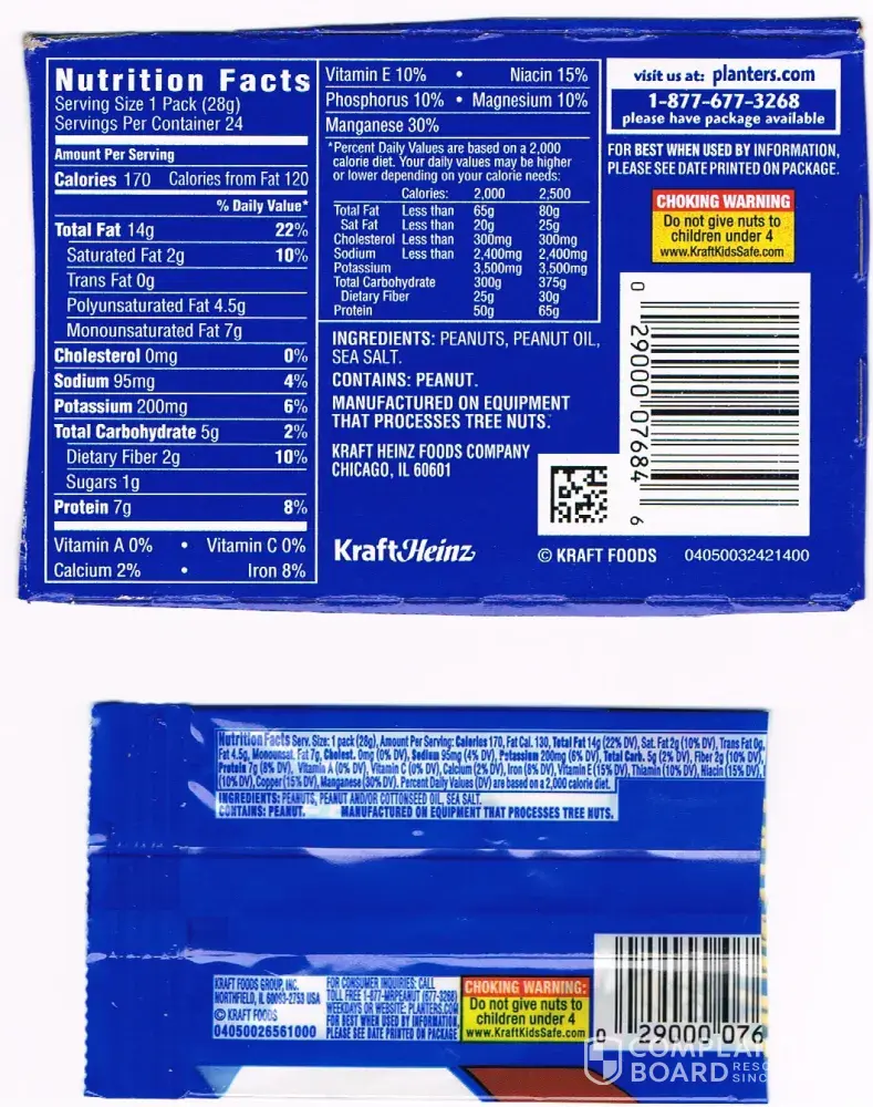 Sam's Club carries a 48 oz. box of 48 individually wrapped 1 oz. servings of Planters peanuts. The outside box states that the ingredients are: peanuts, peanut oil and sea salt. I am on a whole food, plant based diet therefore the purity of ingredients are important. These minimal ingredients and usage of the natural oils from the peanuts sold me on this purchase. Inside the main box are two individual boxes each containing 24 1 oz. packets and again on the box the ingredients list: peanuts, peanut oil and sea salt. But when finally getting to the 1 oz. packets the labeled ingredients include: peanuts, peanut and/or cottonseed oil and sea salt. Cottonseed oil, even though may be acceptable by FDA standards, is not for those of us who depend on the organic quality of foods.