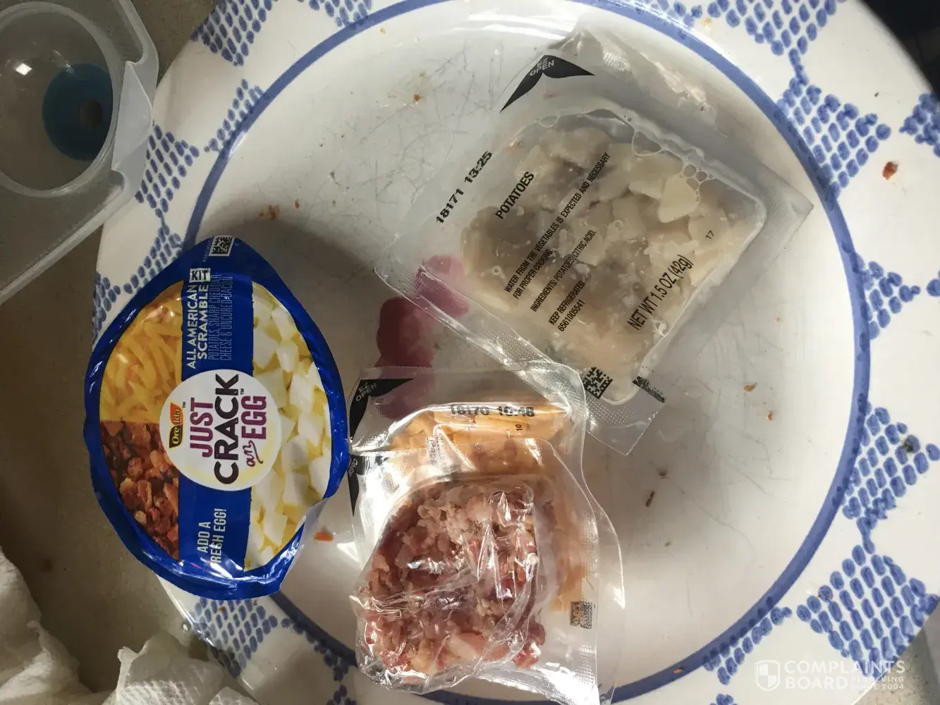 I bought the item on August 23 and opened it on August 26. Potato package was slightly open, juice in bottom of container and potatoes were discolored! Did not notice until I had already cracked the egg!