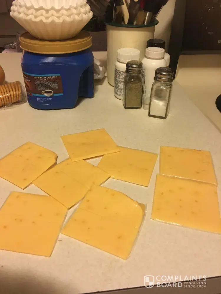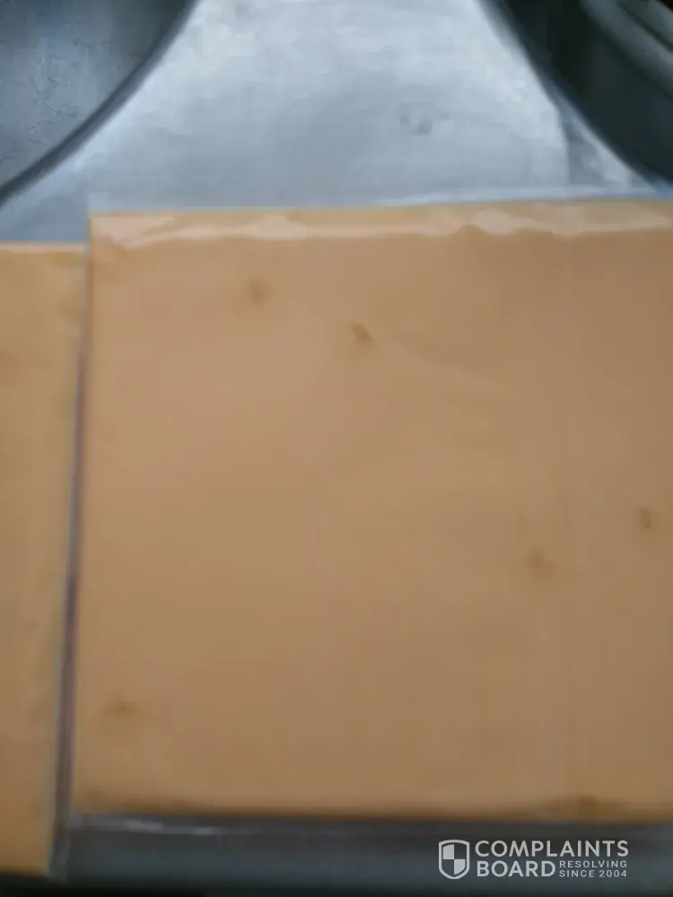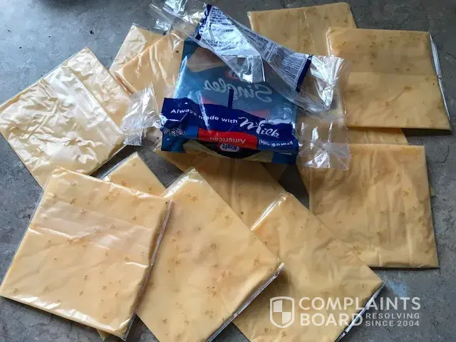 I always buy your large box of three pack cheese slices. On the ends of the cheese slices they are hard and dark like there dried out on the ends. I like your cheese singles and I'm 62 years old and never had a complaint about any of your products till now. Could you please replace this box because I'm on social security and every dollar is valuable to me. Thank You