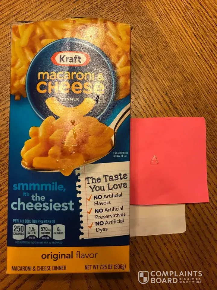 I purchased a five pack of original Kraft Macaroni & Cheese and the first box I opened I noticed a strange smell. When I pulled the cheese pouch out the whole top of the cheese pack looked burnt and was falling apart. I opened another box and it was the same thing. All five boxes were the same way. Very strange smell and black specs of the pouch throughout noodles. Not able to eat and pretty dissapointed. What happens to the quality assurance team? How many of these five packs were sold? I'm unable to upload the pics that I took.