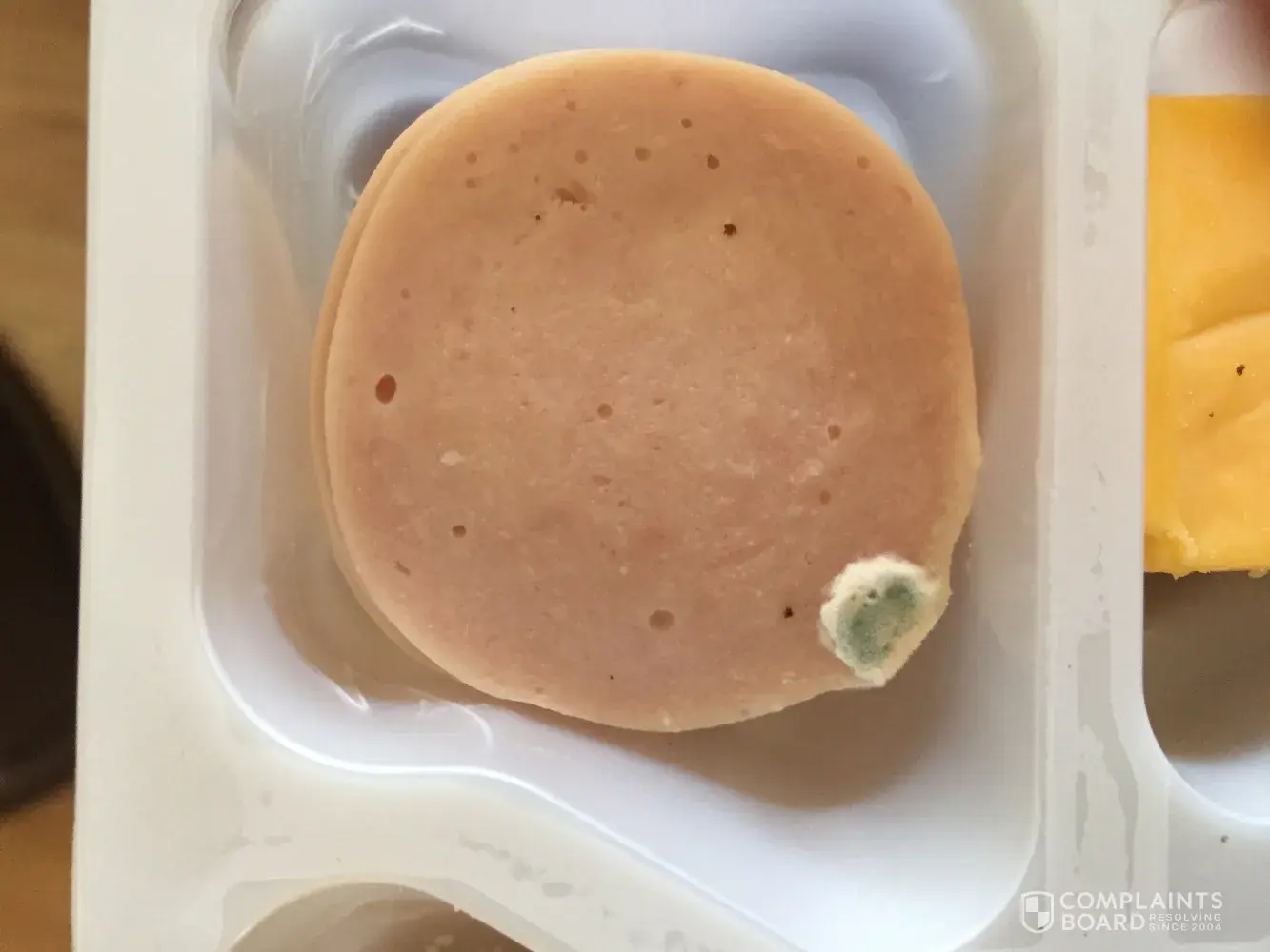 On February 3, 2018 I purchased a Turkey and American cheese Lunchable from a Shawano, Wisconsin Walmart. A Walmart employee was stocking the case, and I purchased one the the lunchables the employee just placed into the case (I personally saw her put this item in the case). As soon as I opened the package (not even an hour later) there was noticeable mold growing on the turkey. The mold is about a pencil eraser size, and only appears to be on the ham but I did not look any further. The exportation date is March 10, 3018.