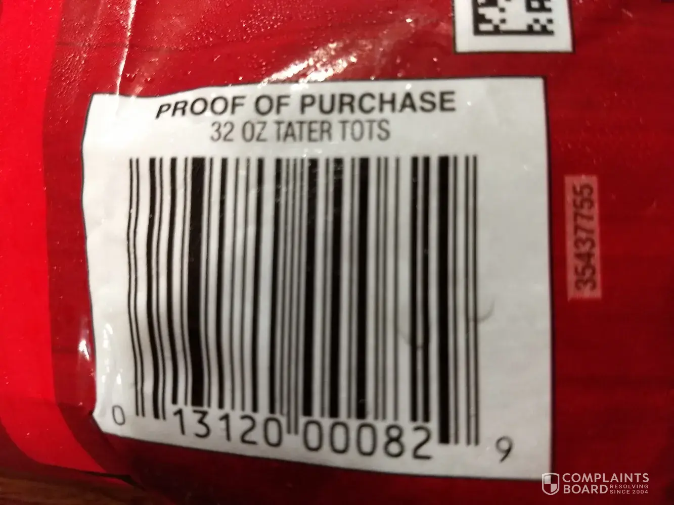 I purchased these at Walmart neighborhood store two days ago. The tots we're all black inside of them and we're falling apart. Also they had a bad odor. I was very dissatisfied with them! I am adding photos to show of how bad they looked right out of the bag. And photos of the UPC code as I didn't keep my receipt. My family loves these so much and this is not the first time I have had this problem.