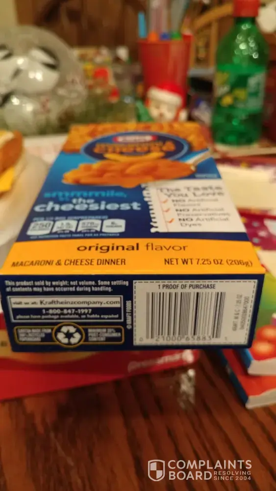 We cooked mac & cheese for supper this evening. When going to get a second helping, I noticed "something" sticking up in my Mac & cheese. Upon inspection, I pulled out a piece of plastic that is used to secure tags on clothing at stores. I have pictures of the plastic piece and a picture of the box if you need that information. I tried to call the complaint in this evening, but customer care was closed for the evening. My contact information is as follows:
