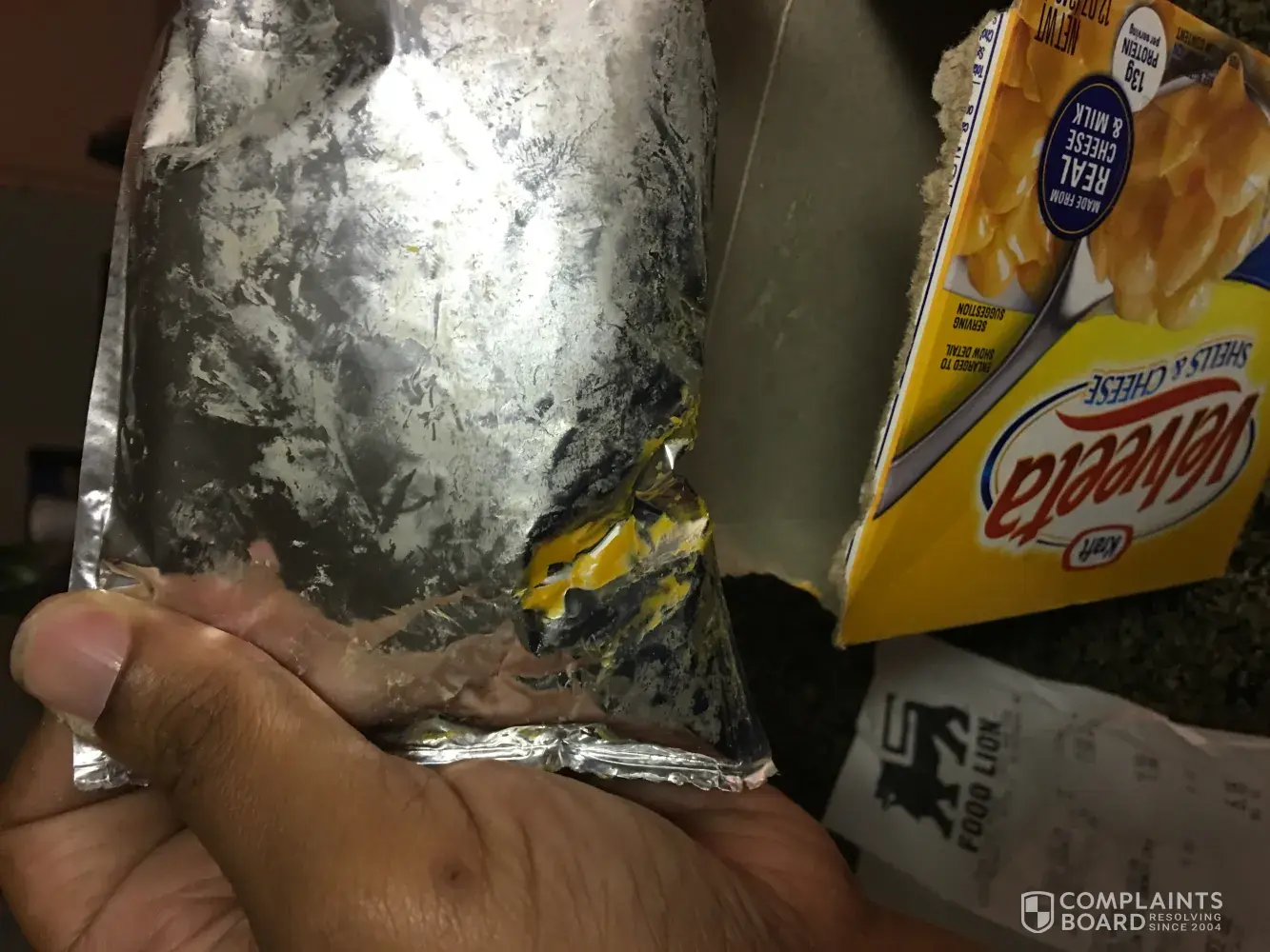 I purchased a box of Velveeta Shells and cheese original today from. Food Lion store. I opened the box to prepare it and the cheese packet had dried cheese and who knows what the other dried substance was all around the outside of the packet that was sitting inside of the noodles. It was disgusting looking. I returned the product. To the store. I did not purchase another as to not take a chance on a repeat purchase. Curious as to how something like that could be packaged and sent to a store.