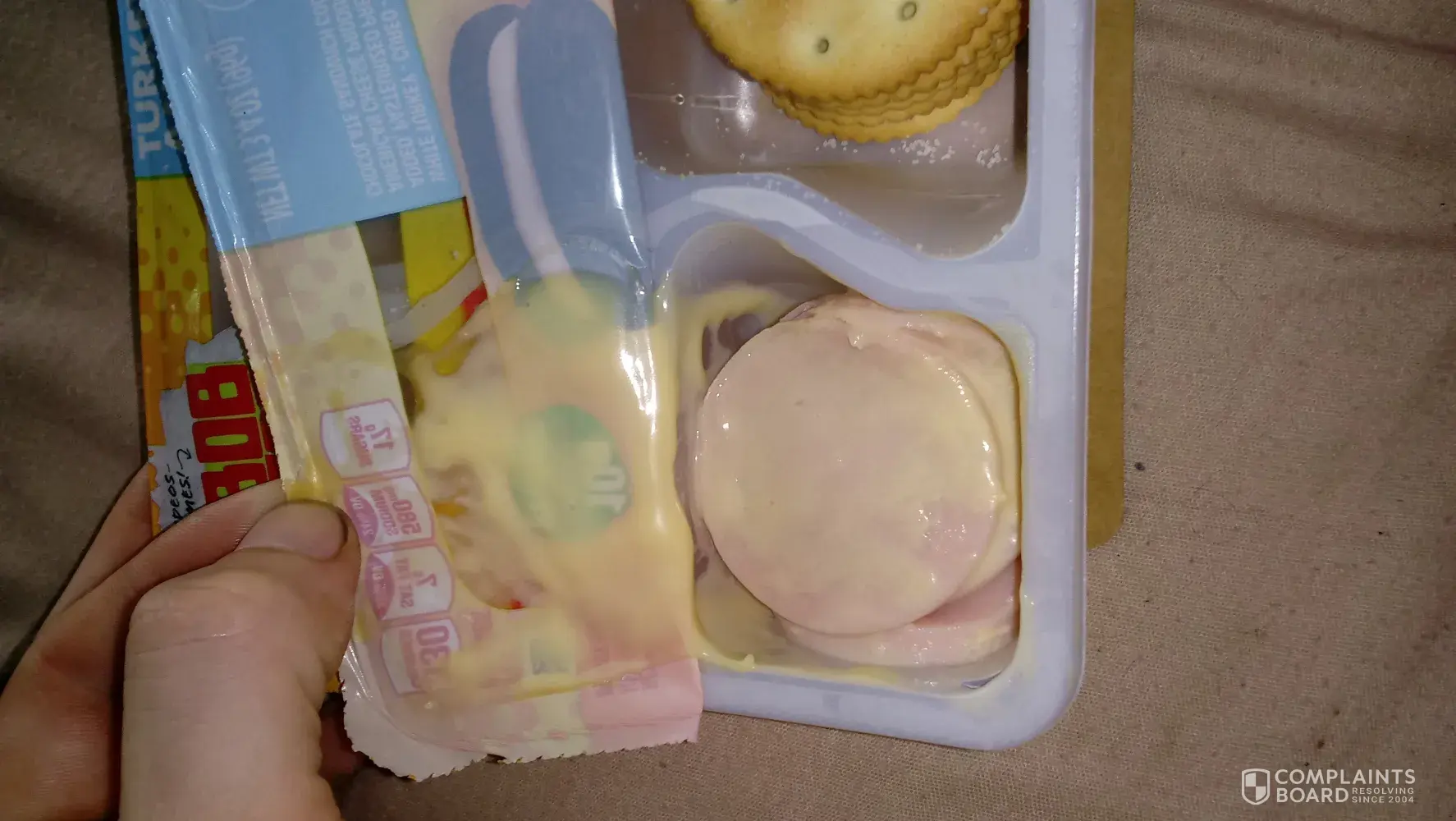 Bought a Turkey and American cracker Lunchables 2 days ago for my son and in the rush of things at the store did not realize there was some sort of goo on the meat. When I opened it for my son I realized what I had missed while purchasing it, I want to say its cheese sauce but am not completely sure and did not feed it to my child.in total I purchased 5 of this kind and only had one with this issue.