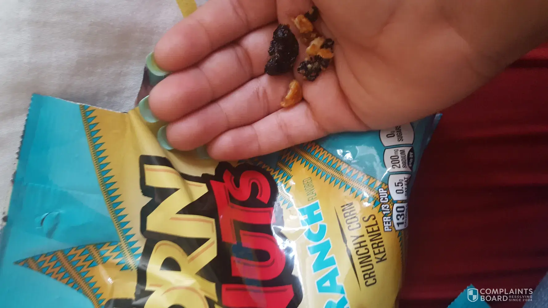On July 15, 2017 around 2pm, I bought the ranch corn nuts from a local shopping store. I always buy the ranch corn nuts when I visit this store. But today was a little different. The corn nuts tasted funny and I was wondering why but I didn't pay any mind until I poured some in to my mouth and when I started to chew it wasn't hard and crunchy. Instead it was this very big black chewy thing, I have no idea what it was, almost like rubber. It was very disgusting and I had to throw away the rest of the corn nuts.