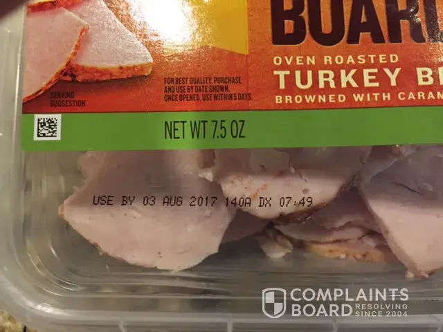 On July 1, 2017 I opened a 7.5 oz package of Oscar Meyer Carving Board turkey. The package contents were spoiled. I took photos of the package and contents which are attached.