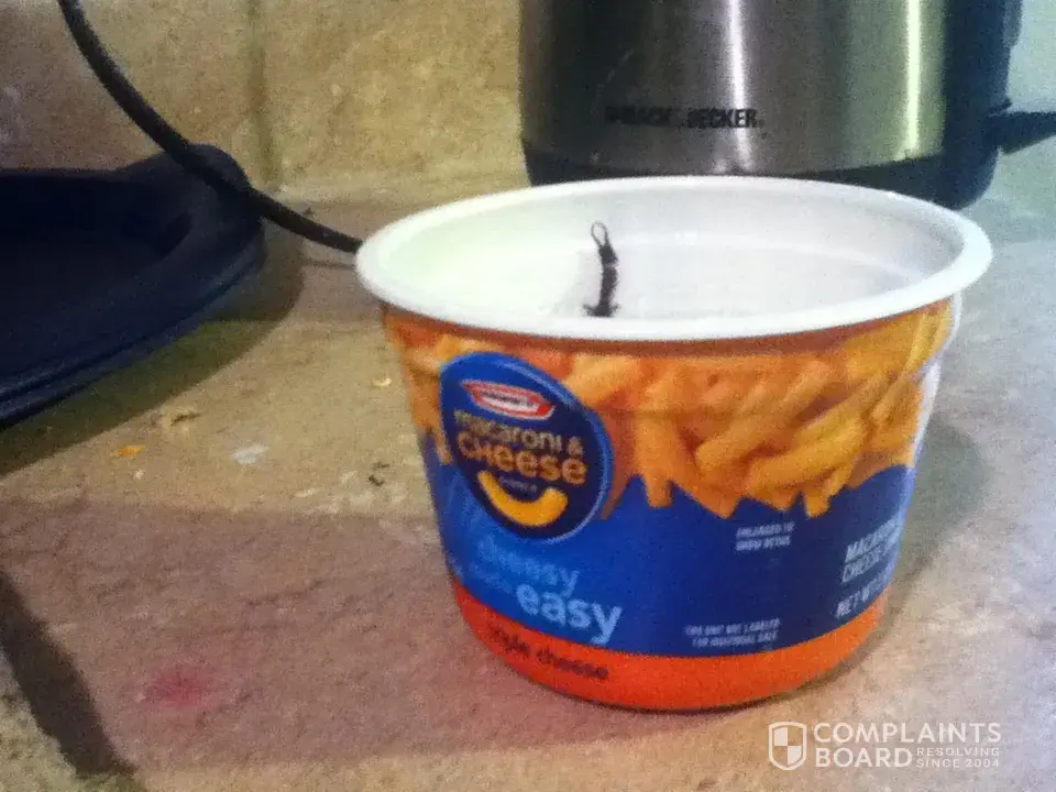 As I was pouring hot water into a cup of easy mac n cheese as just another after school snack, a small black object floated to the top. When I pulled it up the wall of the cup, it appeared to be a dead bug(or skeleton of some sort of bug). I commonly ate these quick, easy cups of mac n cheese, but was disgusted and disappointed when presented with this.