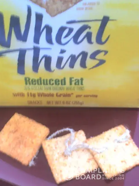 I purchased a box of Kraft Foods Reduced Fat Wheat Thins on September 15, 2010 at Kroger Food Store in Dawsonville, Georgia. My husband opened this unexpired box on September 20, 2010 and halfway through the box an unidentified object was found – embedded in several crackers, holding them together. It appeared to possibly be a long, worn string or perhaps a used mop string. At this time we are still unsure what type of fabric holds the crackers together. I have pictures of this product and would like to get it out to the media because if it is a product of a defective machine, and other boxes could be filled with this material, it could be a choking hazard or more of a health hazard.