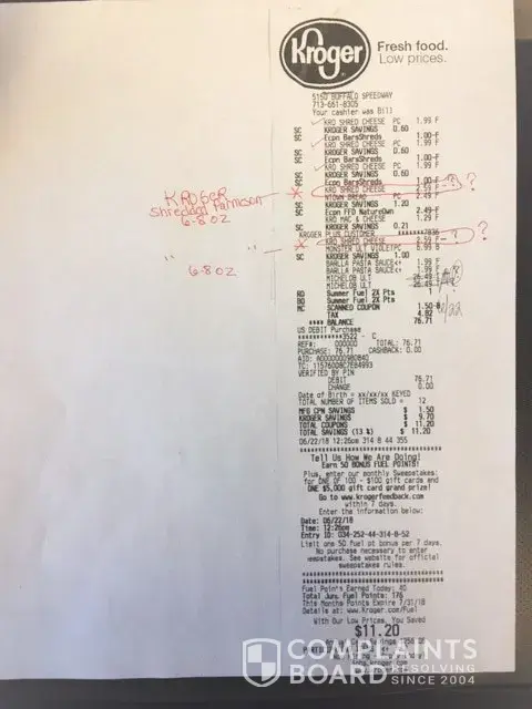 I bought three mild shredded Kroger cheese and 2 Kroger parmesan shredded cheese all 6-8 oz on June 22, 2018. I saw that the Kroger shredded parmesan cheese ($2.59) was not honored went back into store and talk to management and they said Kroger Parmesan Cheese was the only cheese EXCLUDED from using the coupon (see photo) . I showed the printout which stated ANY VARIETY and the store still wouldn't honor the coupon. (see photo)