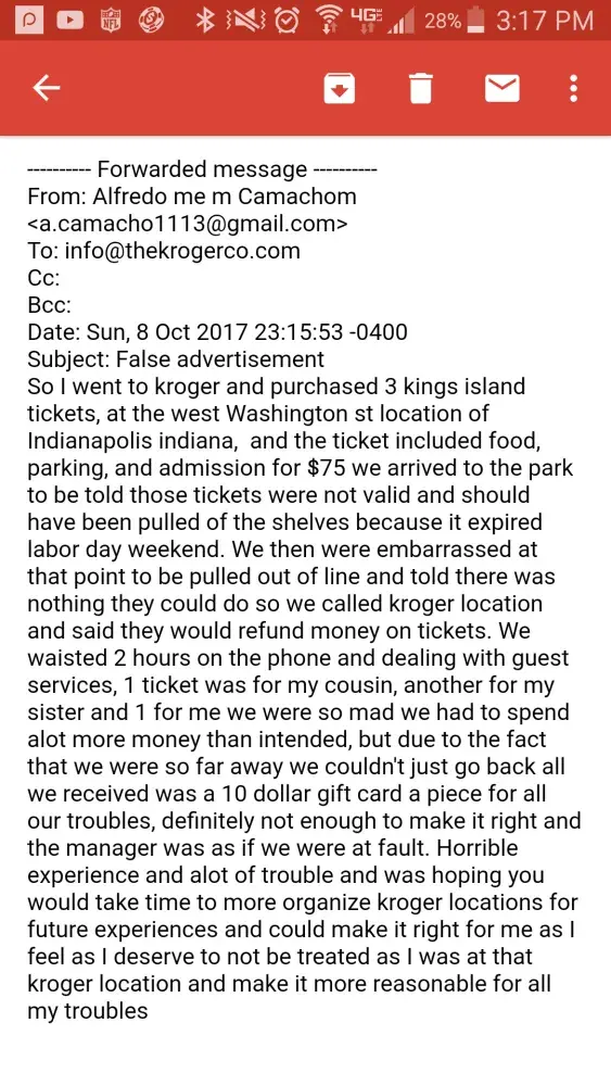 I tried sending to email I found but I would not go through I have attached in the photo area the email I tried to send. This was a lot of trouble and I feel as if I didn't get treated as I should have. The embarrassment alone was terrible. I mainly don't understand how you couldn't realize that they were selling expired tickets for such a big organization.