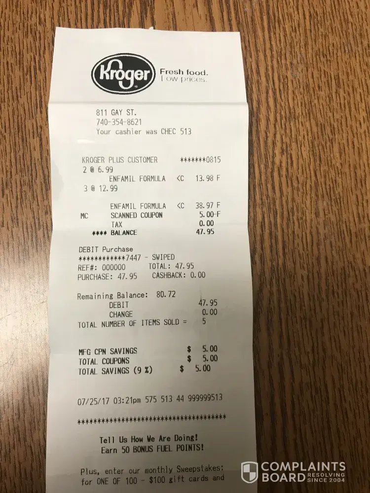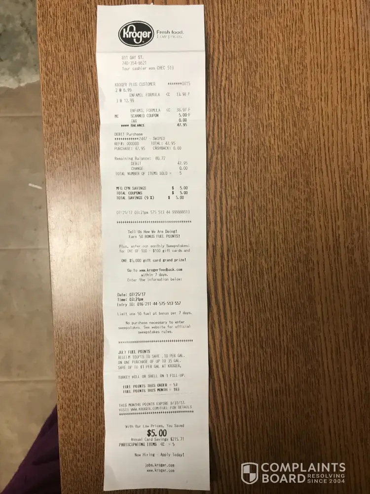 This is an email (along with proof of purchase) that I had to send to Catalina because my coupon did not print. Instead of being able to use the "printed coupon" for a subsequent purchase, which I had all intentions on doing, I was handed this inconvienience. Had I not of already purchased the formula and not having time to deal with the "return hassle" in your stores, I would have returned it and spent my money elsewhere. I think I will stick to auto ship on Amazon for my formula and diaper needs. The only reason that I brought myself to go ahead with this purchase is because I had an enfamil coupon that was about ready to expire that I wanted to use instead of waiting. My orders with Amazon are never wrong, my discount/sale promotions are taken out at time of monthly auto ship charge and if I want to return something, it's almost easier than dealing with returns inside your stores. Come on Kroger! Get it together! Please read the following as it pertains to your chain.