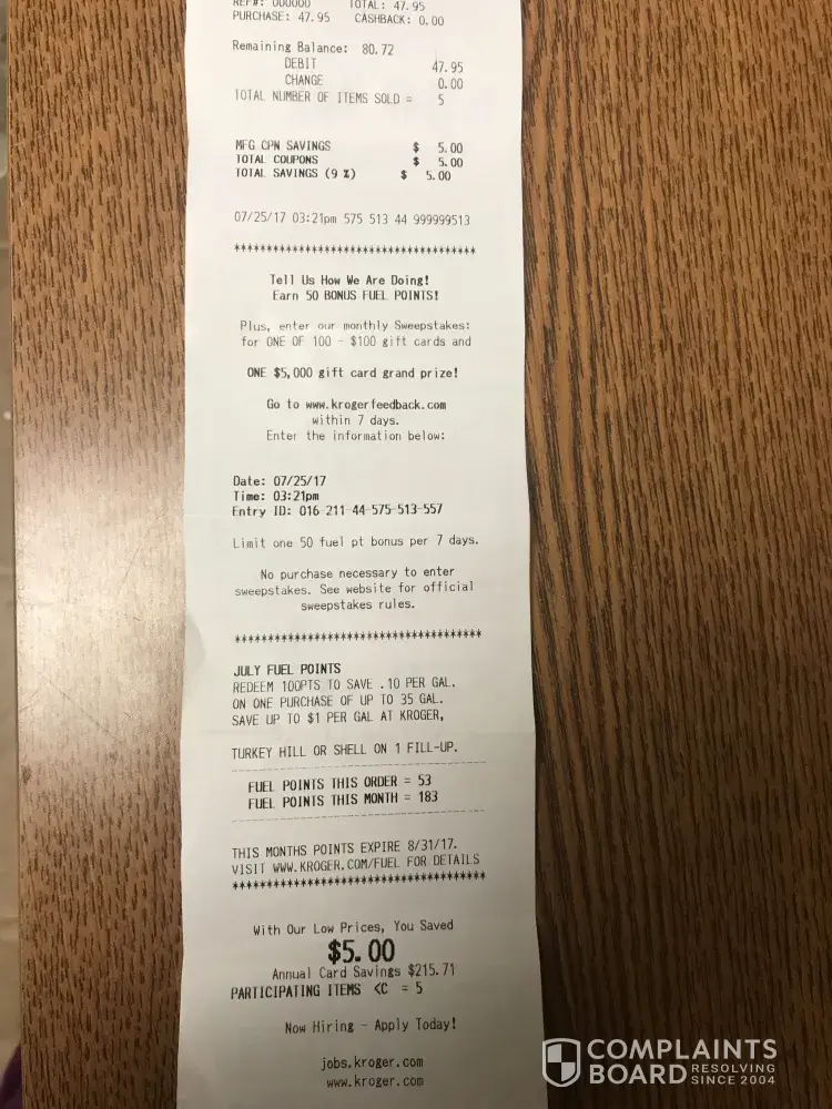 I went to kroger at about 11:00 thinking it would be easier boy was I wrong. For one I dont think the guy liked his job. He was mad because I had coupons and told me not to shop this late with coupons. He would get mad when a coupon was giving him trouble and the employee would start cussing about it and how he hated coupons they were just a waist of time, I said well I love to coupon and it takes a little time for me to clip them and get them together to go shopping and all you wanna do is [censor] about them. Also on some of the products I was buying I new I would get Catalina's for so I asked him why they werent printing and he said because its out of paper so I said isnt that your job to replace it he said yeah but I'm not going to. He finally got so mad handed me my coupons back told me to pay for my stuff and come back tomorrow to get my money back from my coupons. So I paid $66.81 when it should of been $37.81. So Im very upset that I gotta go back to get my $30 kroger owes me.