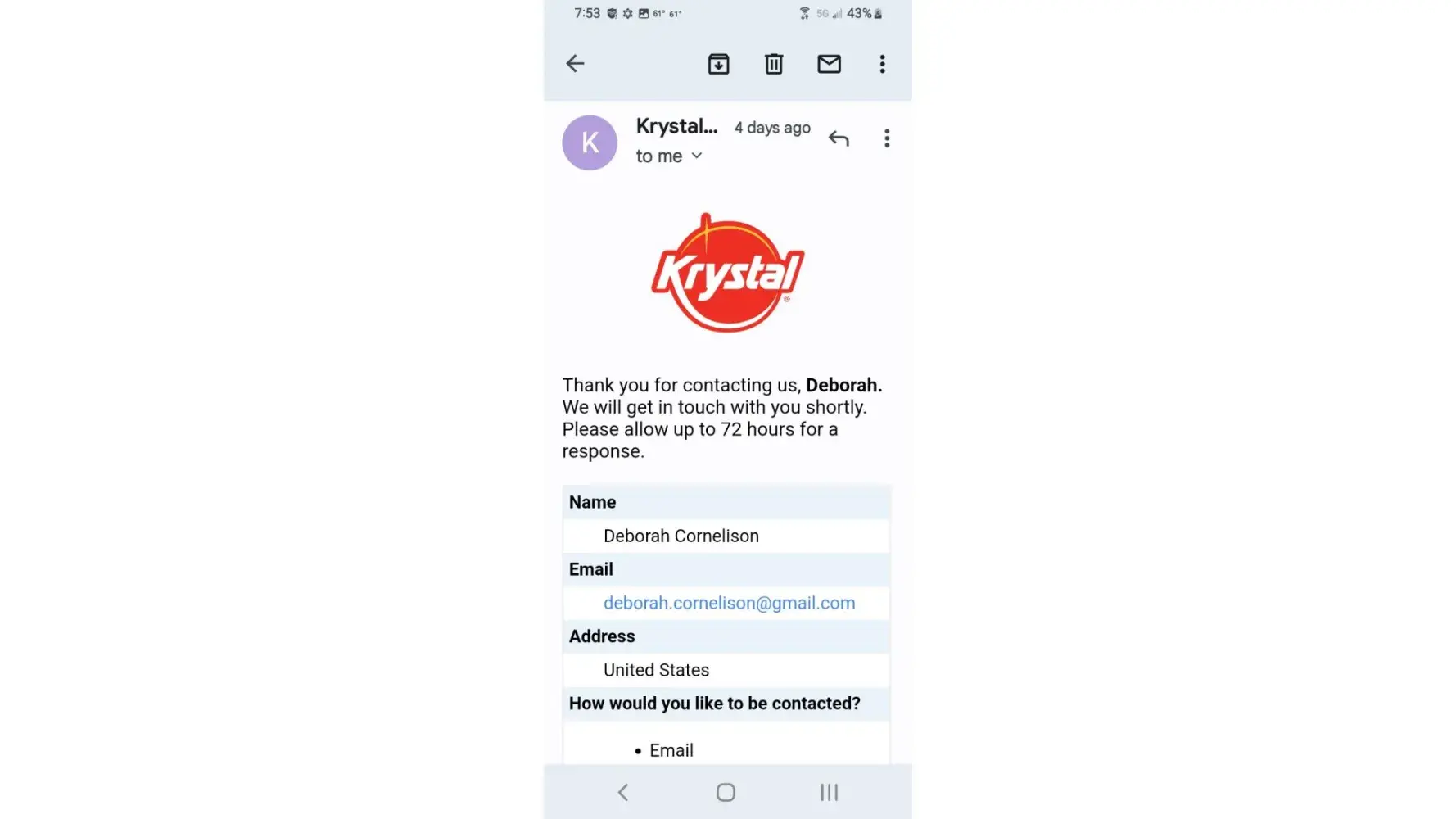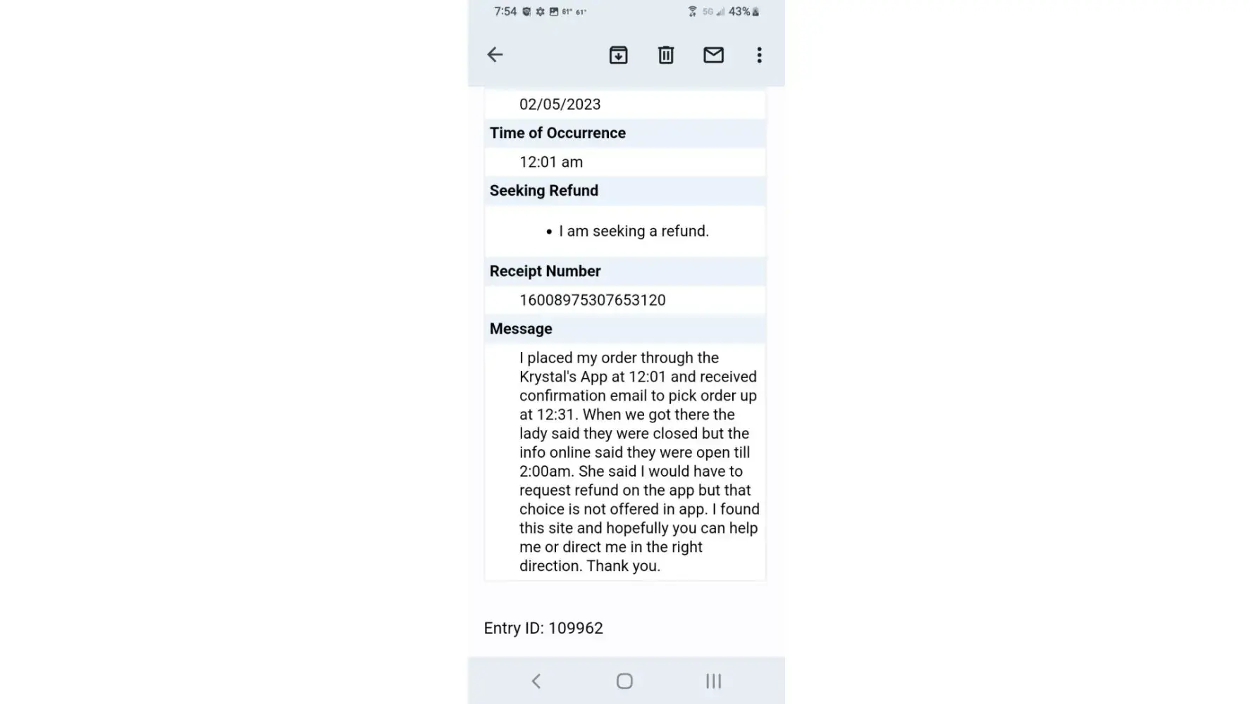 Desired outcome: Wishing a phone call back to me. If Krystal don’t need my business let me know for I know these people did not want to work that day “ COVID†is not pandemic anymore it’s here but business are open