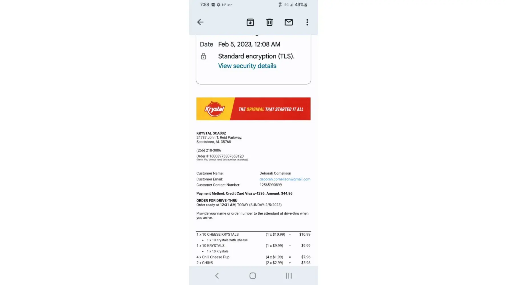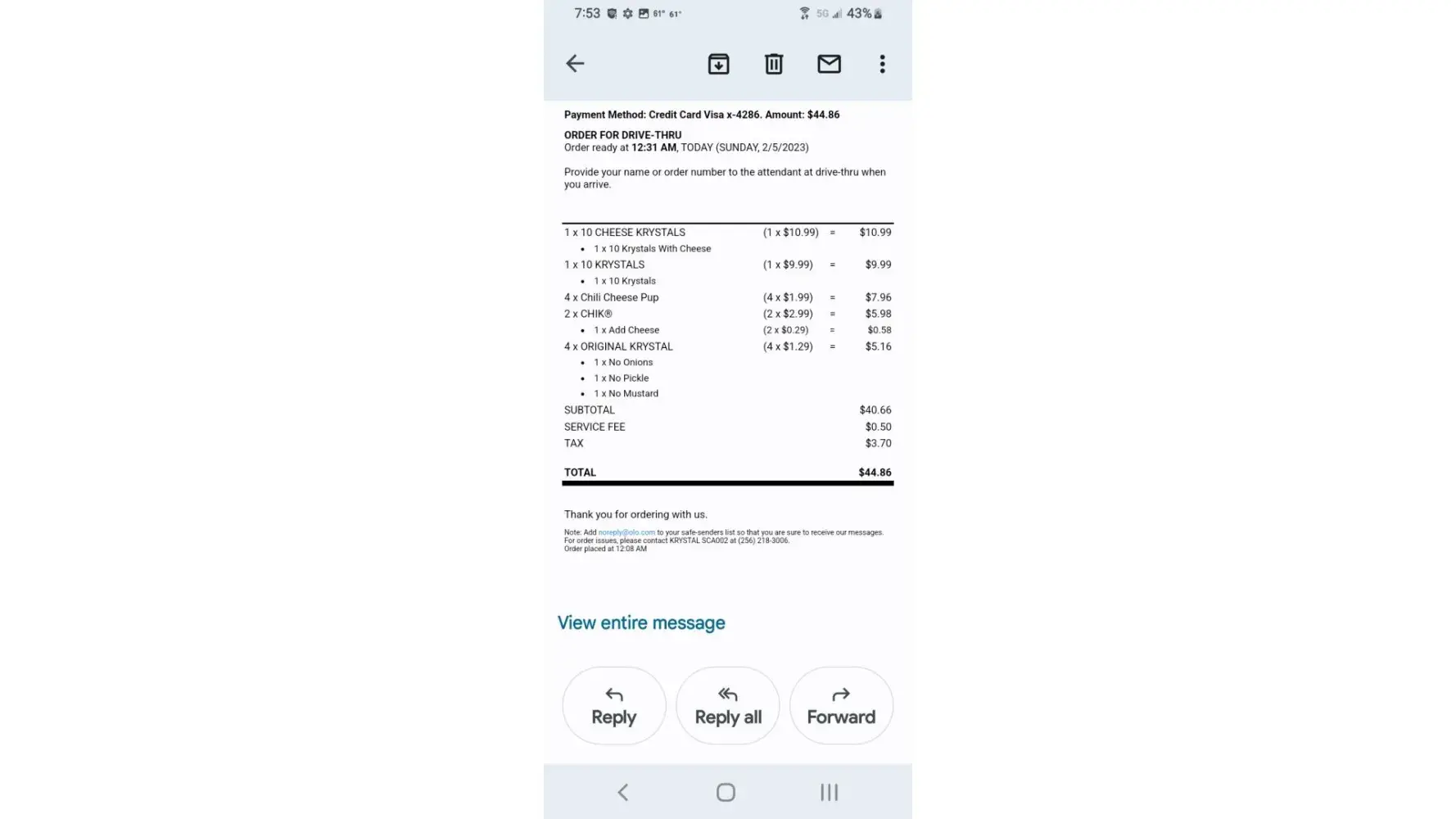 On February the 5th at 12:08 a.m. I placed an order using the Krystal app. I received a confirmation email stating to pick my order up at 12:31 a.m. When we got to the restaurant a lady employee was walking out and said that they were closed. I proceeded to tell her that I placed an online order and paid with my card and that the website showed they closed...