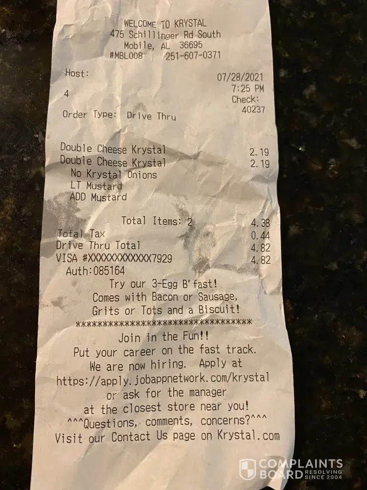 I placed a order for two double cheese krystals, no middle bread when I received my order it was wrong, I had no cheese and onions added, I ordered no onions, the cashier told me she was in the freezer she didn't hear me order cheese, she asked me to put the cheese on my self she will pass it out the window, I was so affendened, the covid-19 is out, I told...