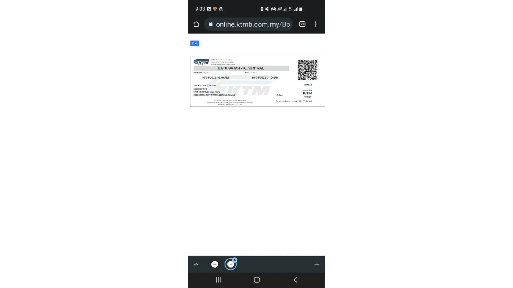 Saya membeli tiket dari kuala kangsar ke kl sentral pada 21/4 tiket itu sepatutnya pada pukul 5.18 petang tetapi saya menunggu sehingga 6.06 baru keretapi sampai