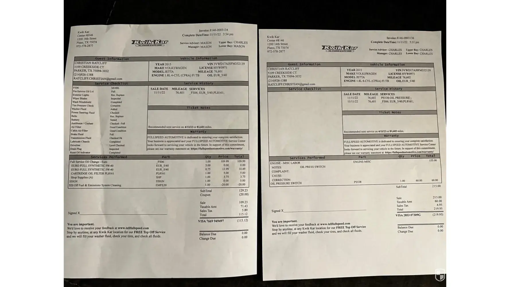 On 11/11/2022 brought a 2015 VW Jetta in for scheduled oil change.