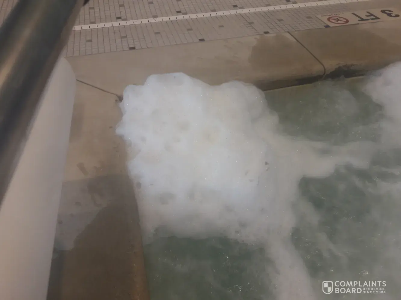 Next, I got into the pool from the edge. As I placed my hand on the side to get in, my hand was touching GREEN ALGAE that was forming on several areas of the side of the pool. Green algae is a high risk for bacteria, parasites and viruses. This concerns me the most because the amount of elderly adults who were in the pool for exercise class and putting their health at risk due to the pool not being kept clean. It was very obvious that the tile on the side of the pool is not cleaned on a daily basis which is extremely important when maintaining a pool that is used by several people everyday.