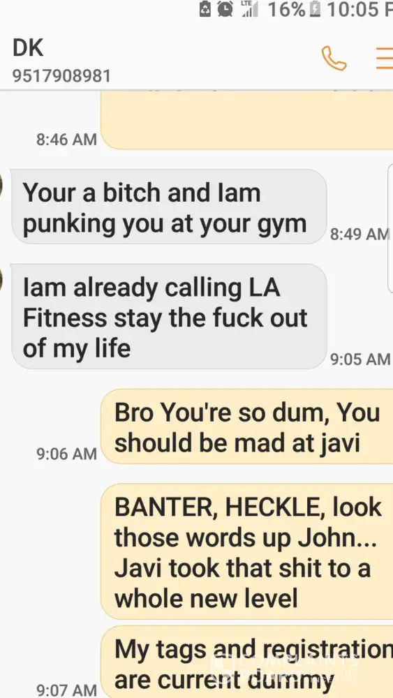 Hello I am Jason P My phone nunber is [protected] I am being threatened and harrassed by one of your memebers. I and my family are long time members. This person harassing me is named John Anthony Lopez: his phone number is (951) 790-8981 and who's phone number is at the top left of my provided screen shots, is physically threatening me via a recent phone call, and is calling the gym facility and spreading false rumors and accusations against me. I want to attend Your facility in peace. Please revoke His membership so I can feel safer, and so he doesn't cause any disturbances at Your facilities. He is a Googleable professional fighter and again I DON'T want a disturbance at your property nor have my father cancel everyone's membership that he pays in our family also. Please and thank You. I am very offended of his false abusive actions, and fear for my safety while I'm at your property wheras it's the easiest way for him to find me. Thank You very much.