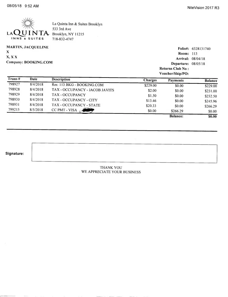 Stayed at a LaQuinta in Brooklyn on Aug 4 and 5th. THe room we reserved was for 229 plus tax