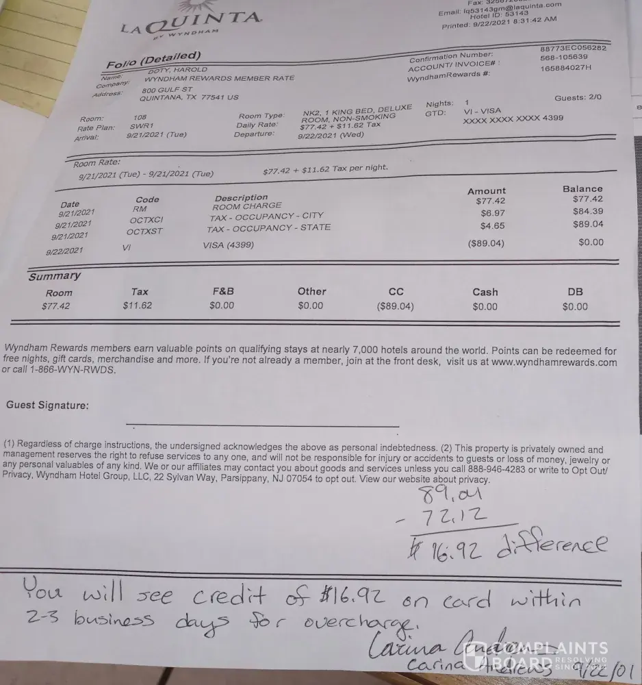 That did not happen, so when I finished my trip and had received my credit card billing statement, I took a picture of the receipt and the screen shot of my original reservation that I had captured and printed, and sent an inquiry to Wyndham after the hotel owner would not return my telephone call.