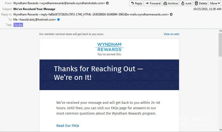 Wyndham sent me an email promptly the next day saying they would get back with me in the next 48 hours. It never happened, so I tried to make another inquiry, which was ignored by Wyndham completely.