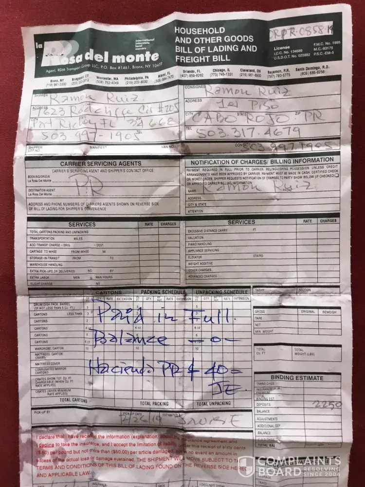 I recently contracted la rosa del monte for my move from NY to NC. I was given the wrong estimate, items were not included, the estimator (Baez) was very unprofessional. The movers were lazy. Pricing was outrageous. Will never move with them again...Hate this company...