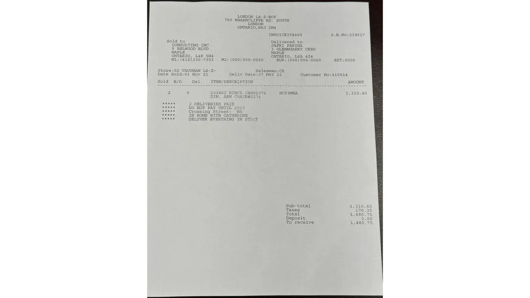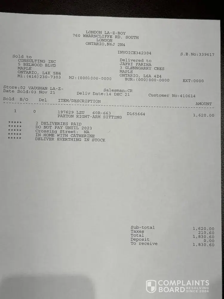 In first delivery there was a curio cabinet that was missing a glass shelf. We informed the sales consultant of that immediately. The second point of contention is the interest we were charged by Flexiti, La-z-boys financier. I received a statement which shocked me traumatically when I saw it! I called Flexiti to discuss the extortionate interest charged of $5366.49 on a balance owing of $4436.38! Despite several and constant follow ups: calls, texts, emails, visits to the store, messages left for and conversations with the sales consultant, and then the assistant manager, manager and customer service director, these issues have remained unresolved.