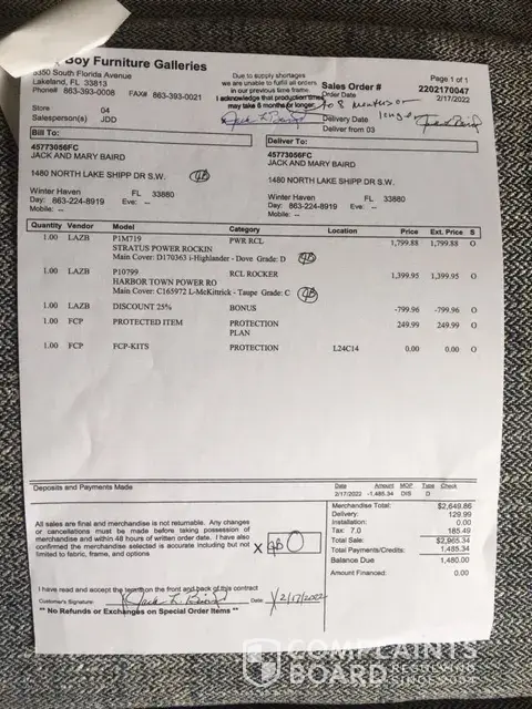On 4/24/2021 I purchased 2 recliners, 1 was style 010777 the other SKU 10X724, from our local Lazboy Furniture Galleries in Huntsville, Alabama. Assistant Manager Jan Langiewicz waited on my wife and me. The sales Contract # was 119723 and we were gonna pick them up in Nov/Dec 2021.It was a week shy of a year when they called and said the recliners were in. I sat in many recliners before decided on one...all told it was $2437.24. While writing up the contract Jan Langiewicz repeated several times that the recliners were made in America...that was a big selling point. When I picked the recliners up, I left them in their boxes to bring home. To my utter surprise...and disgust...my recliner...still in the box...had Made in Mexico all over the box. While I am very disappointed my recliner was made in Mexico, after being told it was to be made in America, that is not what all my complaint is about. My main complaint is that, although it looks good, square and level, after setting in it for a while I realize I'm leaning to the right...I adjust myself to the middle/left only to realize after a while I'm back leaning to the right. Something is either wrong with the cushion or mechanism or something. I posted my original complaint on June 18, 2022, but never received a reply...ya'll responded to my request for a reply to my complaint...was told not enough information...so I am posting my complaint again...thanks