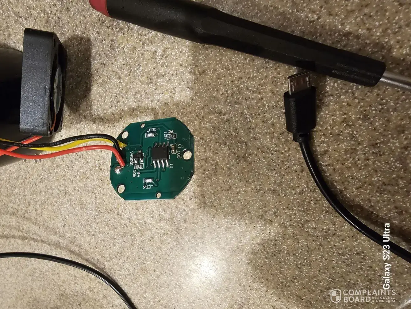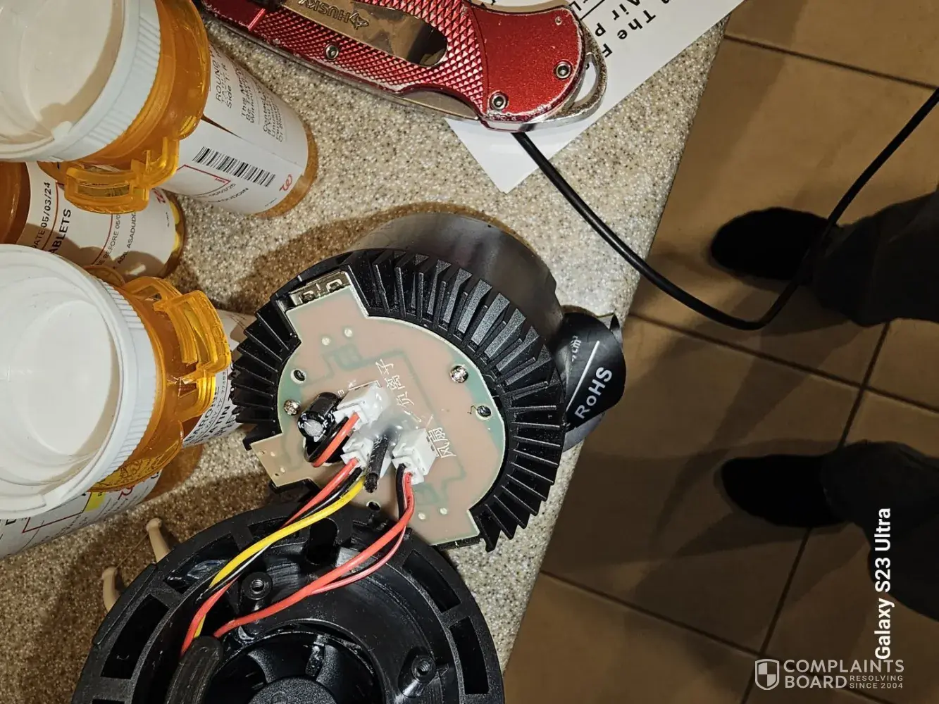 This is a fake device with nothing more inside than a USB power circuit, red, green, and blue LEDs and driver chip, a switch and a fan. Everyone needs to know that LabCharge is promoting snake oil at consumers expense. Placed in the inside bottom of the device there's a weight to give the unit stability and a feel of quality. I have been in electronic component repair on the bench and in the field for 45 years. LABCHARGE should be held accountable. What is the main component of a real ionizer? The main component of an ionizer is an emitter that creates an ionizing field for air to pass through. The emitter can be made of electrostatically charged plates or a high-voltage wire or carbon fiber brush. The only thing missing here is an actual ionizer circuit. This is nothing more than a mood light with a fan.