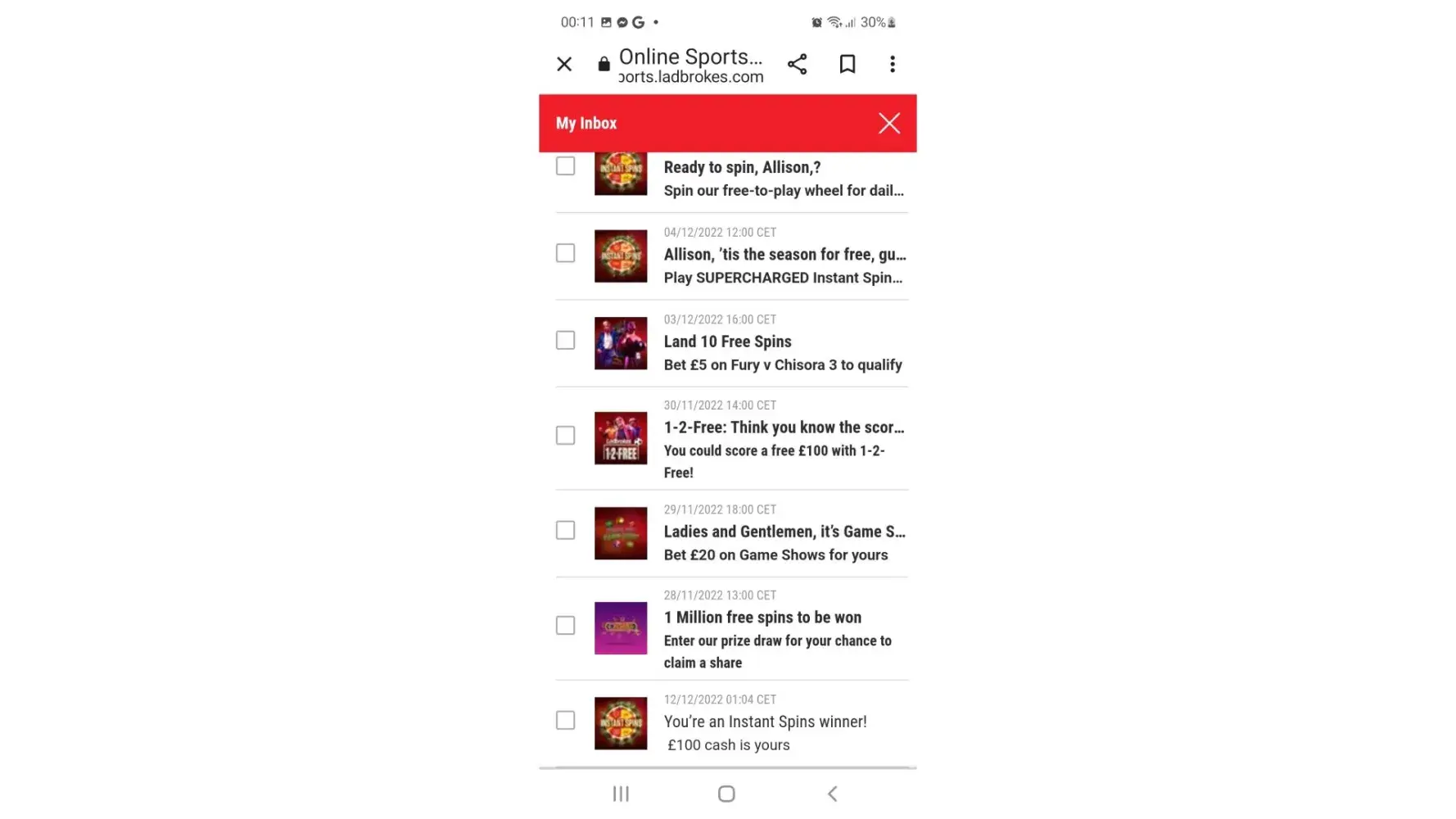 Today the 12/12/2022 at 01.04 I've logged into my account gone to my inbox to see a message to say I'm an instant spin winner of a hundred pounds and it has been credited to my account as it wasn't in my account I rang ladbrokes to speak to a lady who informed me they made a mistake and would give me 10 free spins as a good will gesture which was 20p a spins so I went from thinking I'd won a hundred pounds to get 2pound I think this is totally unfair I screenshot my in box message which I will attach .I was buzzing this morning to think I'd won now I'm really disappointed and hope someone will put his right Allison Greenslade (mitchg1326 accou