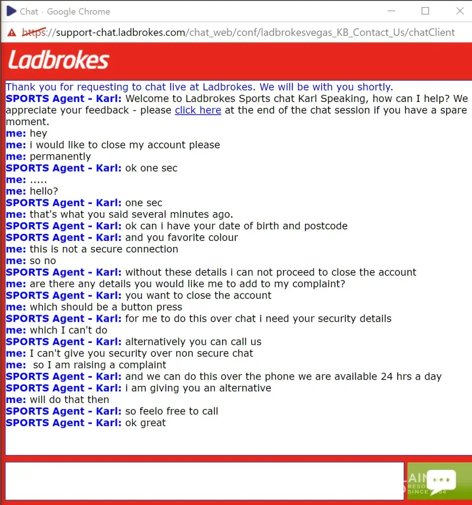 The chat guy literally said ok one sec (Sports agent -Karl) then did nothing for minutes. Then asked for various security info over a non secure connection.
