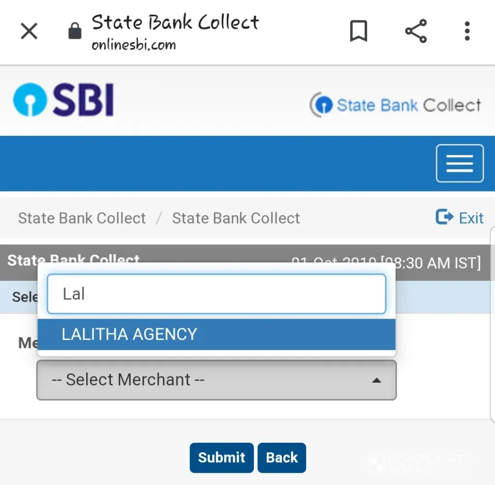 Hi my name is Rajalakshmi, my client id is CHNYBYBDMT000960, my monthly amount is 2500.I am trying to pay online through sbi collect for September month but under merchant name lalithaa jewellery mart pvt l is not available. I have uploaded a screenshot below