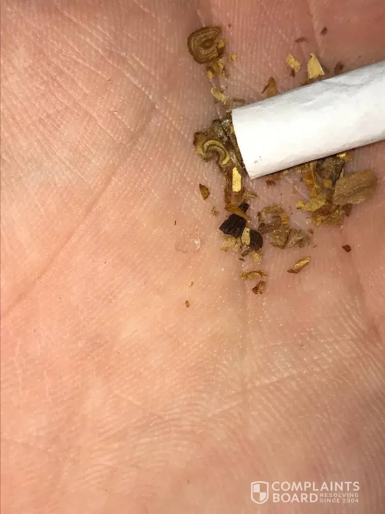 My parter was emptying a cigarette to put into a rizler when he found a tiny piece of something clear, so after we looked at it closely it was actually a small shard of glass. After buying these cigarettes for over 4 years this is unsatisfactory especially for the price at £9.75 a packet, we buy at least two packets a day between us both. This is very disappointing and maybe future checks should be carried out to prevent this happening again. I think we may consider trying out a different brand of cigarettes as they are lacking in the way they are made, and for one of the most expensive cigarettes on the market they should be made the best.