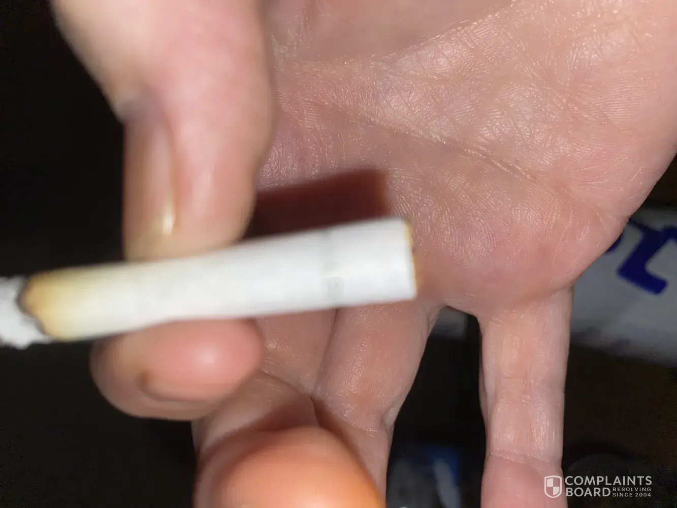 When opening this packet of cigarettes the ones at the front looked different. When I took the first one out the paper was falling off, I checked and about half of them were like this as soon as you touched them.. the few that seemed OK. I lit one am before it could burn enough where I would have to flick it the whole tip just fell off. This burnt my top, the blanket and my skin.