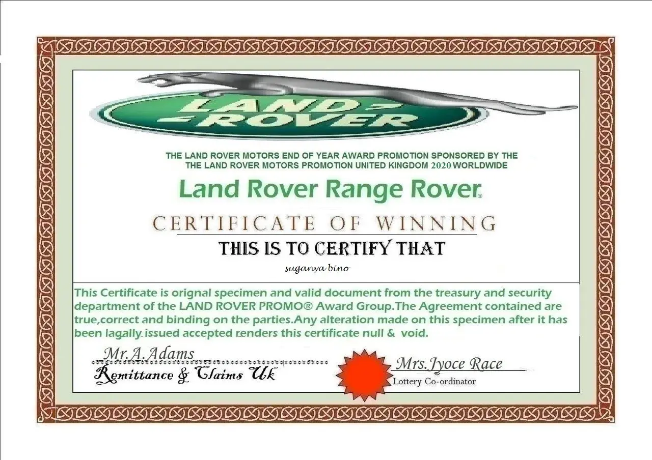 We wish to congratulate you once again on this note, for being one of the lucky winners selected for this year land rover range rover motors mobile promotion 2020. We felicitate with you and your family and especially for being a citizen of (india). This promotion was set-up in united kingdom by land rover range rover motors to encourage prospective mobile users. Congratulations on behalf of the 'land rover range rover motors promotion united kingdom' our screening committee and national advisory board has completed all verification and screening by the screening committee of "uk's overseas national advisory remittance claims unit. You have been approved to received your demand draft and land rover car by a special delivery agent arrival been approved by the regulation council of the land rover range rover motors promotion 2020. Your cash prize of four crore rupees (rs, 4, 00, 00, 000/inr) will be delivered safely to your door step by diplomat mr. Edwards maxwell, having considered all possible measures to convey your cash prize, we resolve to use a special delivery diplomat under the diplomatic umbrella. We have made all necessary arrangement to convey your winning prize direct to your door step. Your name, phone number and address has been received.